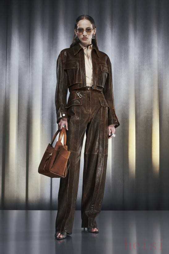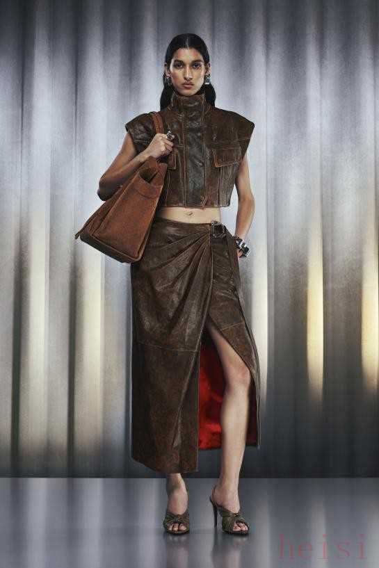 Ferrari Resort 2026Ferrari 2026度假系列由创意总监Rocco Iannone设计,灵感源自1960年代法拉利工坊的怀旧照片,融合了跑车元素与环保理念。这个系列皮革是主要元素,包含多种处理效果和造型设计,如短款夹克、褶皱裙子、工程师风格风衣以及复古飞行员元素的工装裤等,整体设计平衡了复古与现代,体现法拉利的优雅、速度与激情。