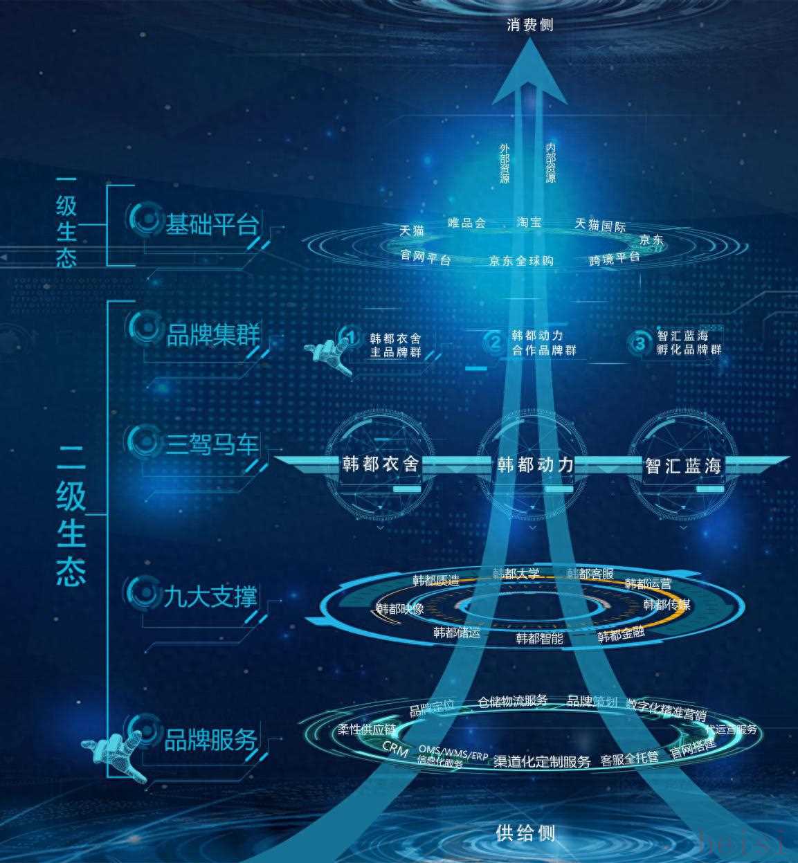 而所谓二级生态,韩都衣舍董事长赵迎光解释称是基于阿里、京东、唯品会等平台等构建的一级生态基础上,依托数字化商业智能系统打造的系统。核心就是其为国内传统品牌、国际大牌、网红品牌、初创品牌等提供线上生态运营。