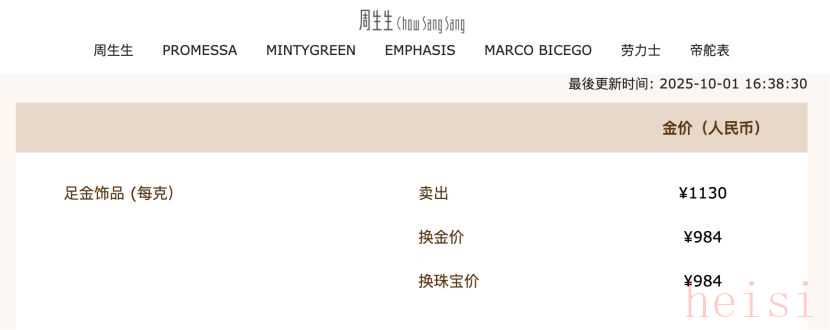 10月1日,记者在黄金珠宝品牌周生生官网看到,其当日足金饰品报价已达到1130元/克,周大福的报价也达到1129元/克。