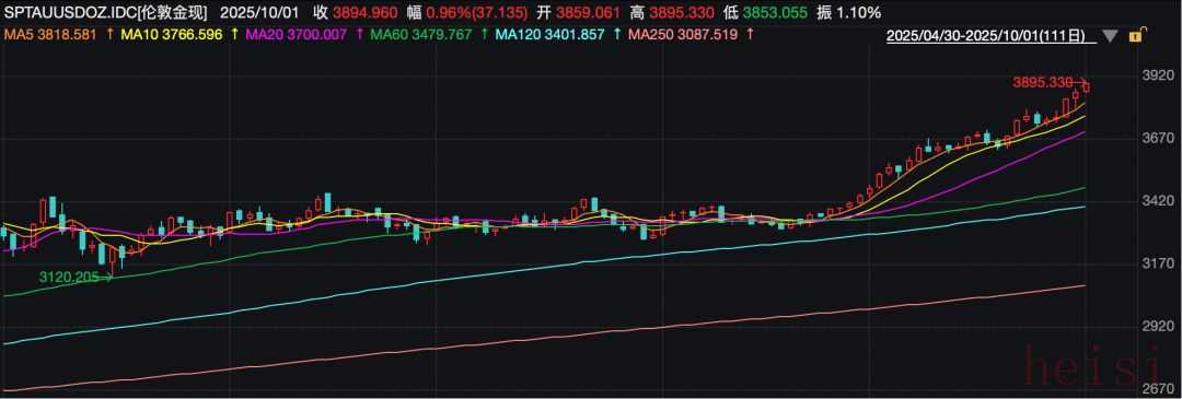 10月1日,国际金价再度走高,伦敦金现盘中最高突破3895美元/盎司,再刷新历史纪录,距离3900美元/盎司关口仅一步之遥。COMEX黄金则突破3900美元/盎司,亦刷新历史纪录。