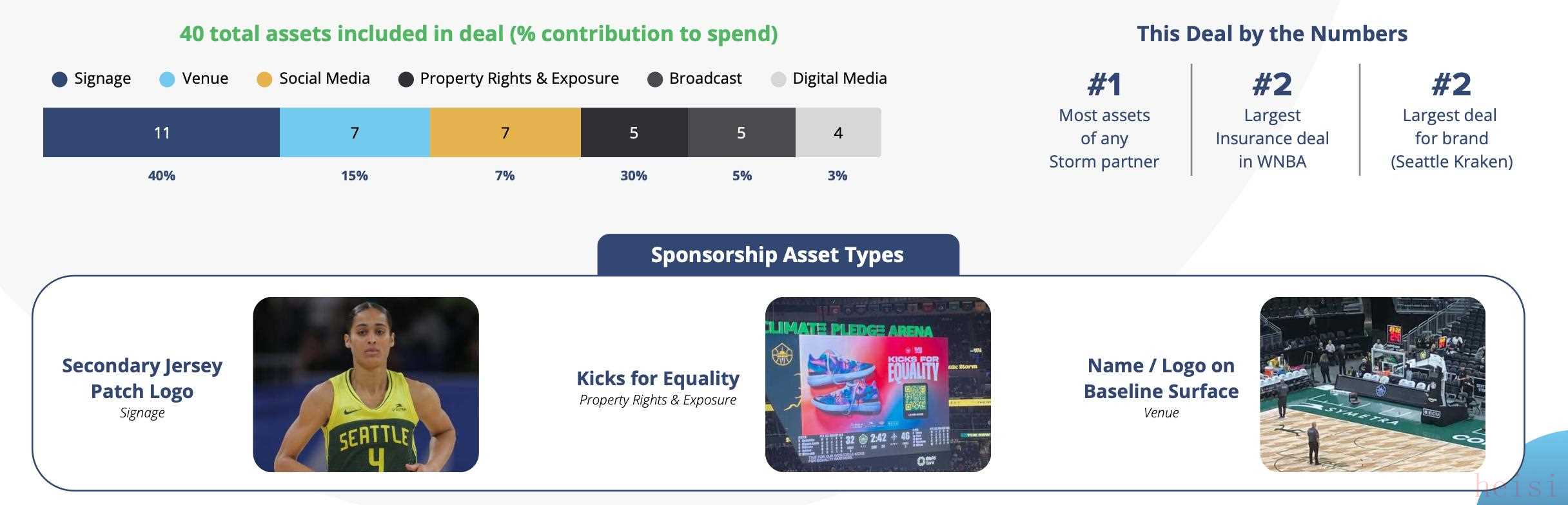 接着是保险行业。报告呈现了美国人寿保险Symetra和西雅图风暴队(Seattle Storm)的合作作为100万至125万美元赞助交易的代表性案例。这项在2019年签署为期10年的合作不仅是该球队历史最大规模的赞助协议,也是至今WNBA联盟中第二大的保险领域赞助交易。根据协议,Symetra的品牌标识出现在球衣的左上肩部,也印刷在了球场地板上助力品牌吸引球迷的注意。
