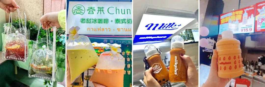 此前大火的泰奶品牌milkplus,同样产品包装上也下了很多功夫,比如推出奶瓶装泰奶、酒瓶装泰奶、水桶装泰奶等等。