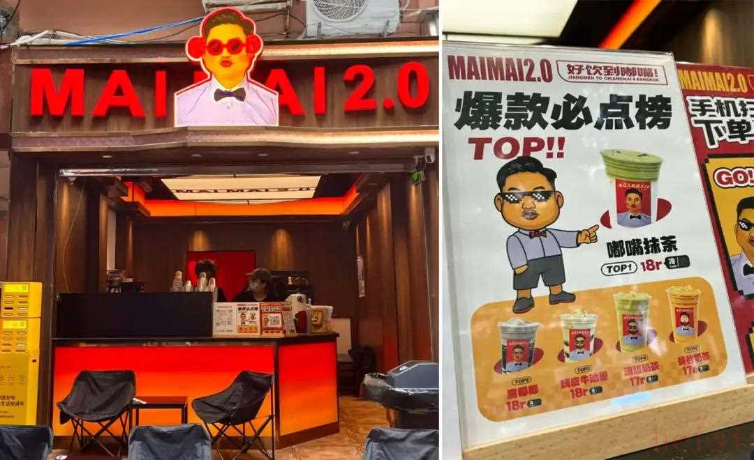 比如江门品牌MAIMAI2.0,与大胡子可可的营销模式有异曲同工之妙,从证件照大叔,变成嘟嘴大叔。不同的产品、不同的口味,logo的眼镜也呈现不同的颜色。该店主打产品有嘟嘴抹茶、清迈奶茶、曼谷奶茶等,客单价在18元左右。