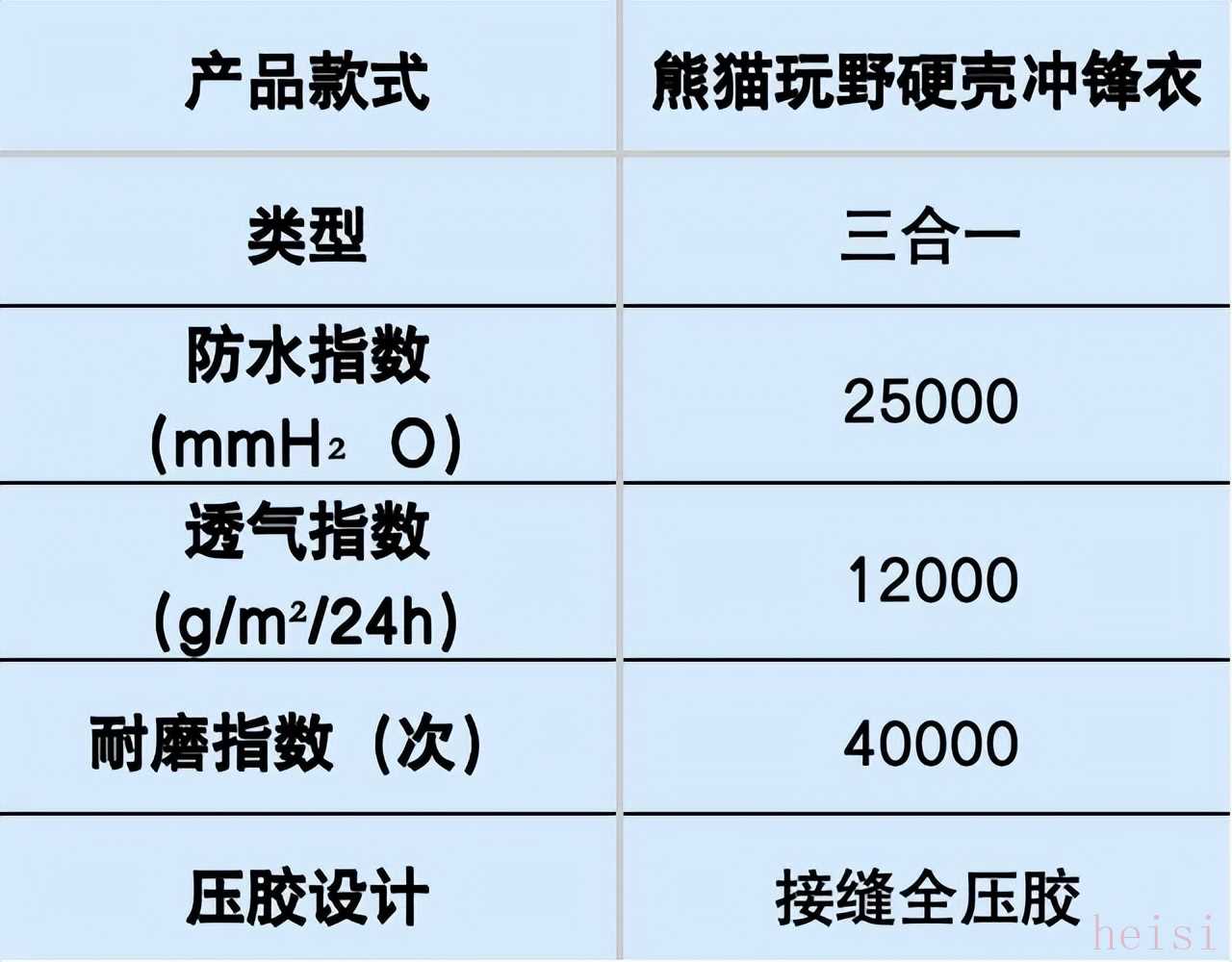 熊猫玩野硬壳用自研“仿生膜”科技面料,防水指数25000mmH₂O,透气性12000g/(㎡·24h),腋下设透气拉链,可手动调节通风,平衡防护与散热。