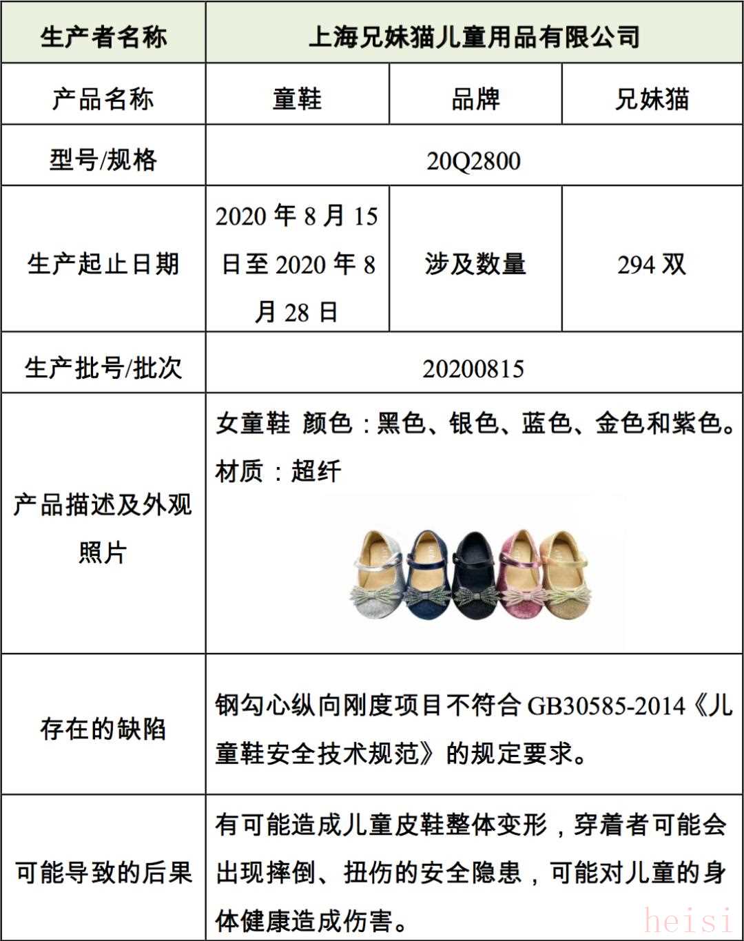 据了解,此次召回的产品为上海兄妹猫儿童用品有限公司在2020年8月15日至8月28日期间生产的型号为20Q2800、生产批次为20200815的女童鞋,涉及294件。召回时间为6月29日至9月28日,公司将安排退货。