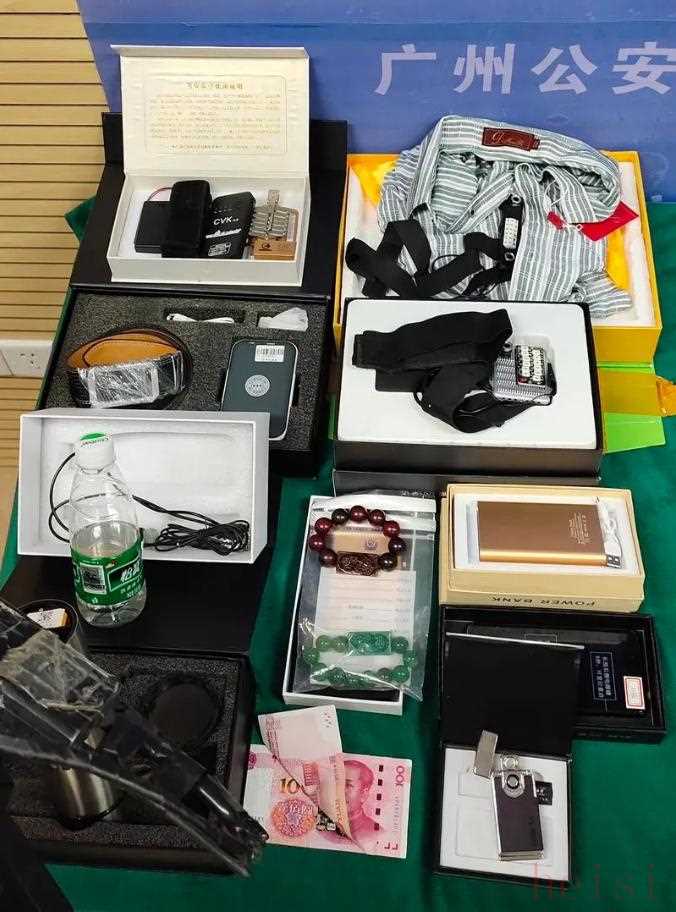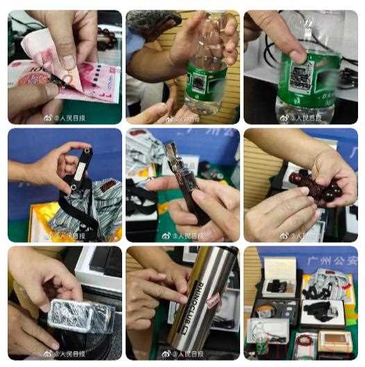 2020年7月,广州警方召开的“飓风2020”专项行动战果发布会,警方展示了在此次行动中收缴的涉案物品,主要为窃照设备。办案民警介绍,该团伙通过将针孔摄像头集成在大量的生活用品上进行伪装改装,比如伪装在矿泉水瓶中,外表看上去是一个普通的水瓶,里面甚至还装有饮用水,但通过仔细辨别可以发现在水瓶的中间部位,犯罪分子进行了改造,将微型针孔摄像头植入到水瓶中间部位,通过水瓶的商品标签掩饰,然后在日常生活场所使用这种设备进行偷拍等违法行为。