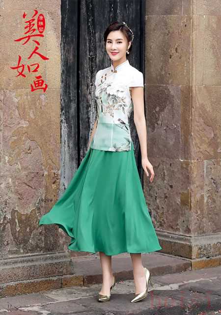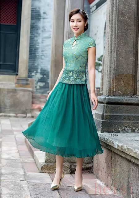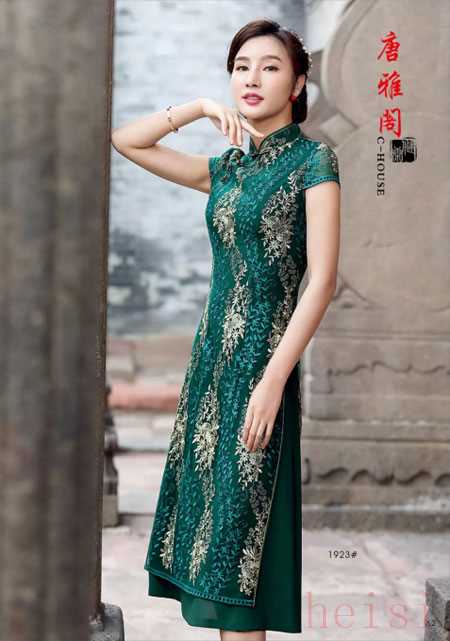 唐雅阁碧色改良旗袍,充分了的利用了中国风元素,上半身复古的立领、立体的刺绣,花型盘口设计,精致而又优雅。下半身雪纺纱裙,多层设计富有的层次感,清新脱俗。