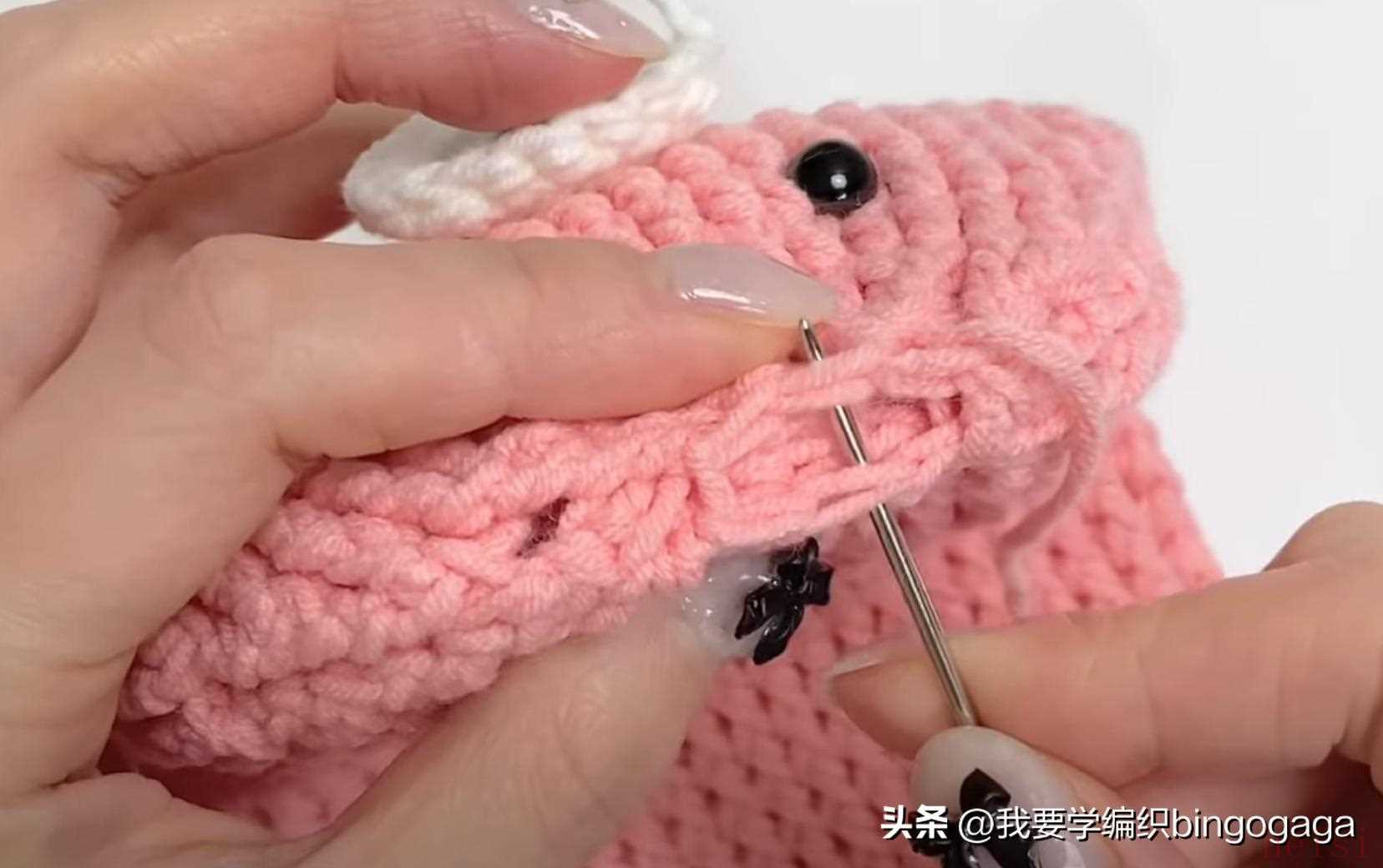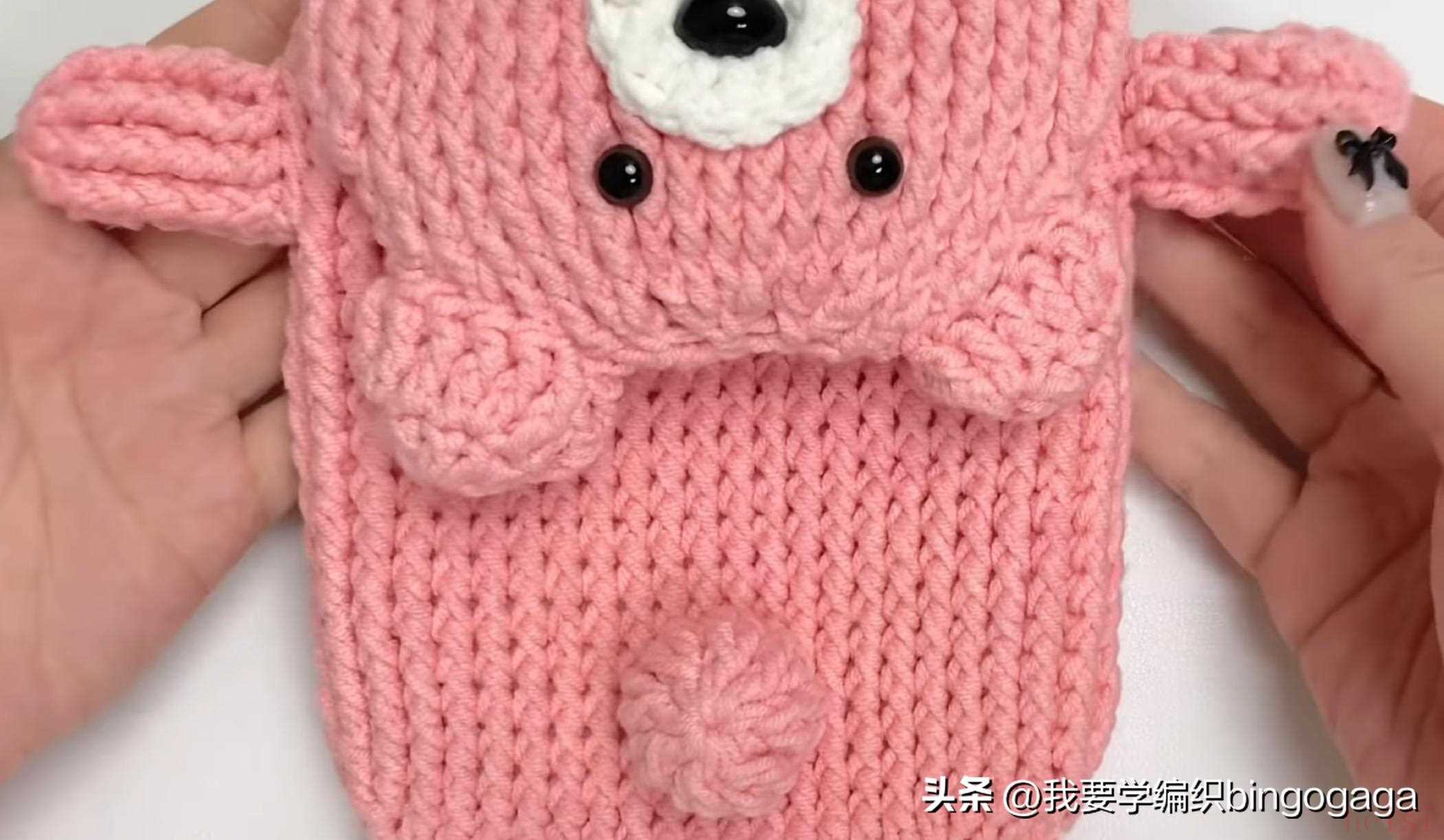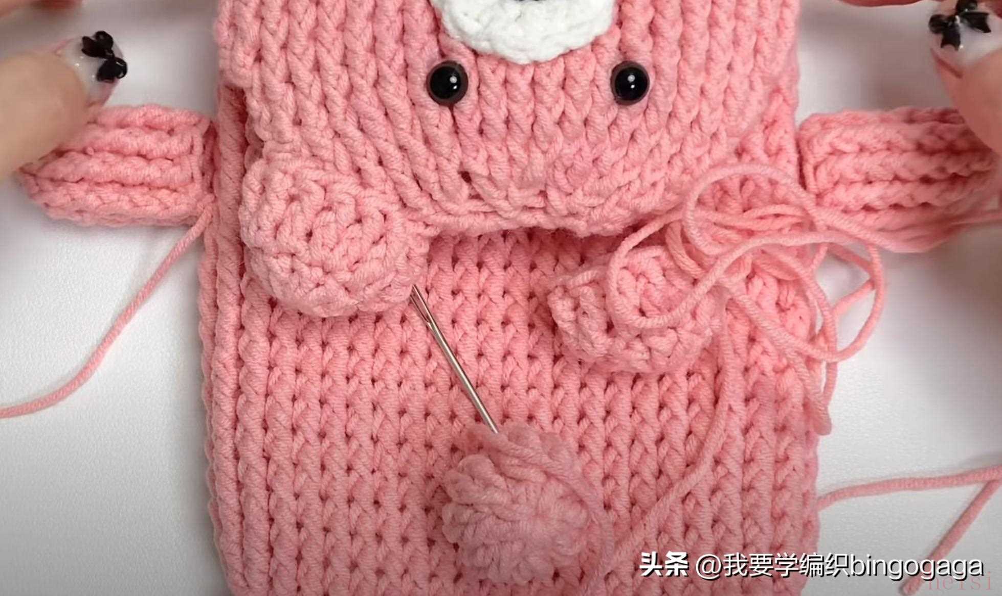 第33圈:中长针2并1,15中长,中长针2并1,长针2并1,15长,长针2并1(每圈引拔),34针;第34圈:34长;第35圈:中长2并1,13中长,中长2并1,长2并1,13长,长2并1,30针;第36圈:长2并1*15次。然后将这部分折下来,缝上鼻子,装上眼睛,塞入一些填充棉。第37圈:中长2并1*7,1中长,还有8针,断线;然后将8针分为4对4,一针对一针进行卷缝;接着另接线挑包口钩一圈引拔针,断线。
