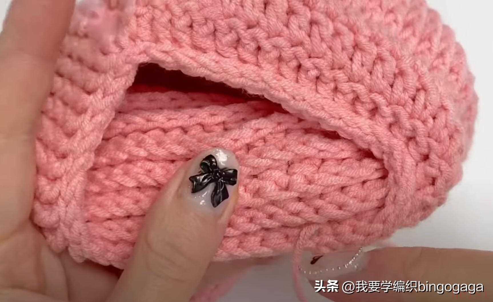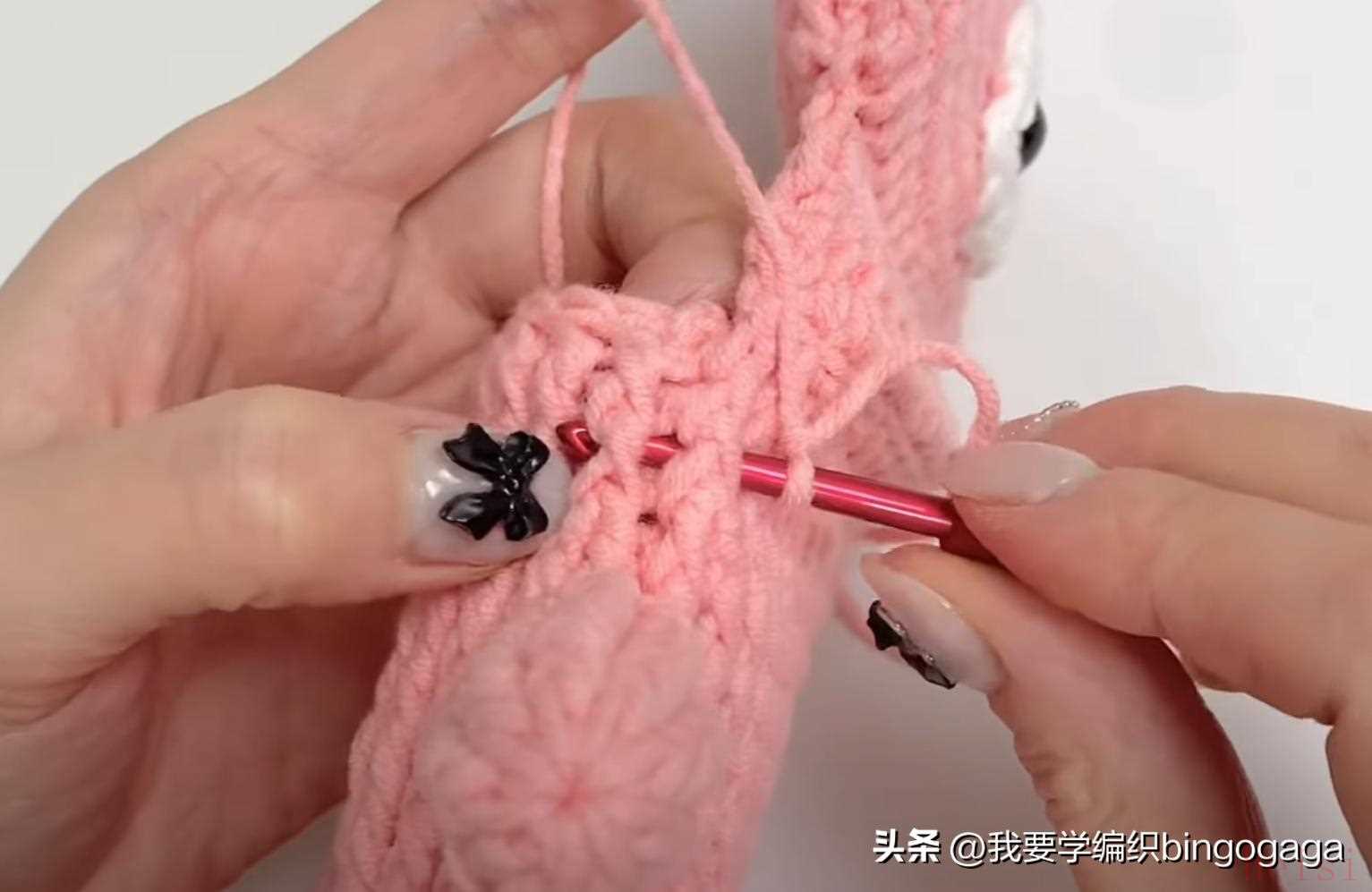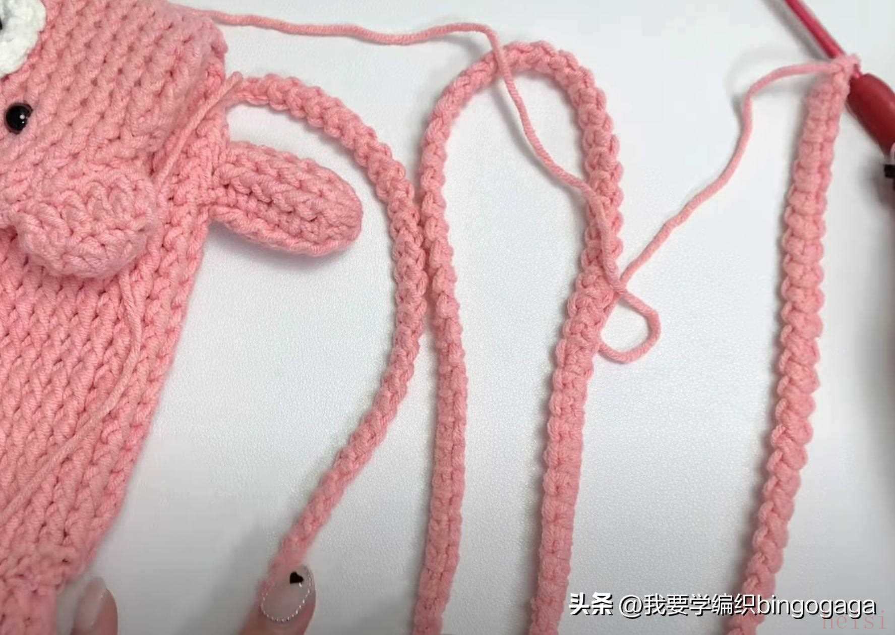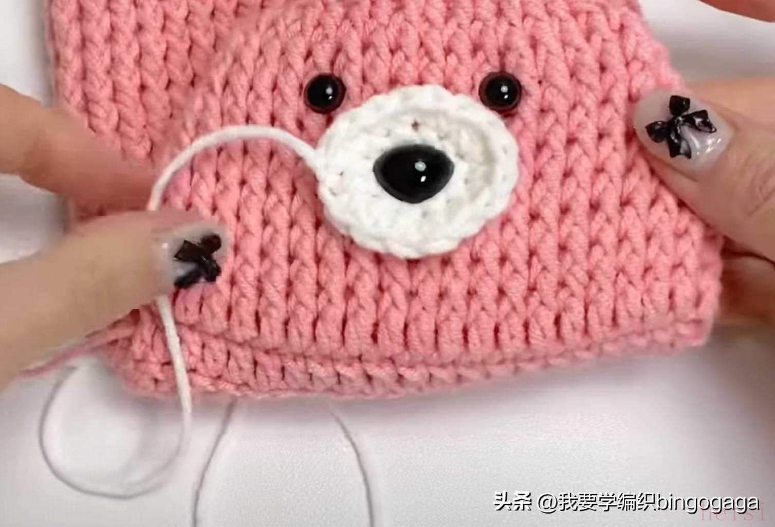 第33圈:中长针2并1,15中长,中长针2并1,长针2并1,15长,长针2并1(每圈引拔),34针;第34圈:34长;第35圈:中长2并1,13中长,中长2并1,长2并1,13长,长2并1,30针;第36圈:长2并1*15次。然后将这部分折下来,缝上鼻子,装上眼睛,塞入一些填充棉。第37圈:中长2并1*7,1中长,还有8针,断线;然后将8针分为4对4,一针对一针进行卷缝;接着另接线挑包口钩一圈引拔针,断线。