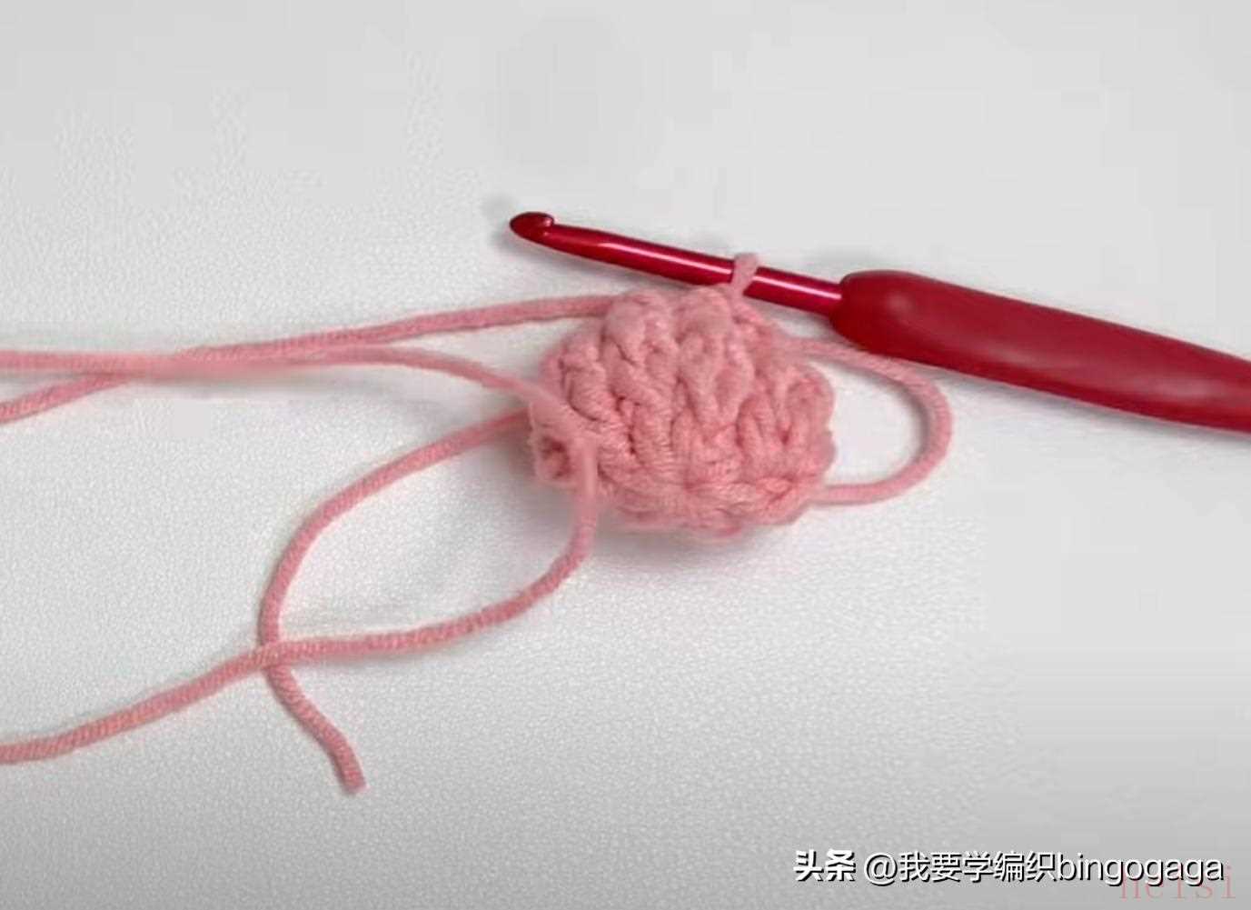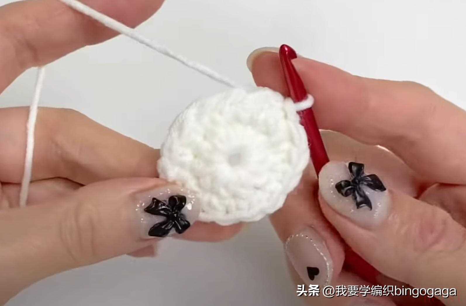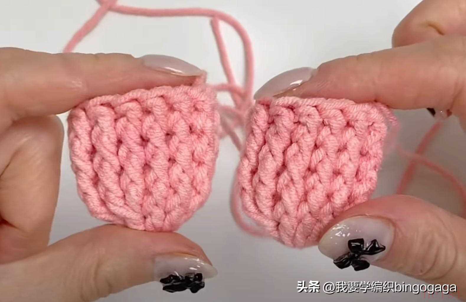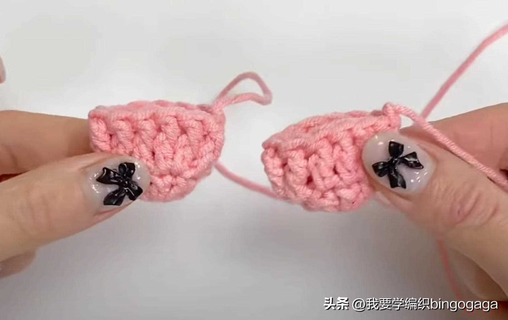 先钩鼻子,A线第1圈:环起,10针中长针;第2圈10针依次钩1放2(中长针),1短,1放2(短针),1短,1放2(中长针),1放2(中长针),1短,1放2(短针),1短,1放2(中长针),16针,断线;接着换B线来钩包包,起18针锁针,第1圈:挑里山,倒入第2针钩3针中长针,再15针中长针,最后1针上钩6针中长针,再15针中长针,最后在第1针上再钩3针中长针,引拔(每圈引拔),42针。