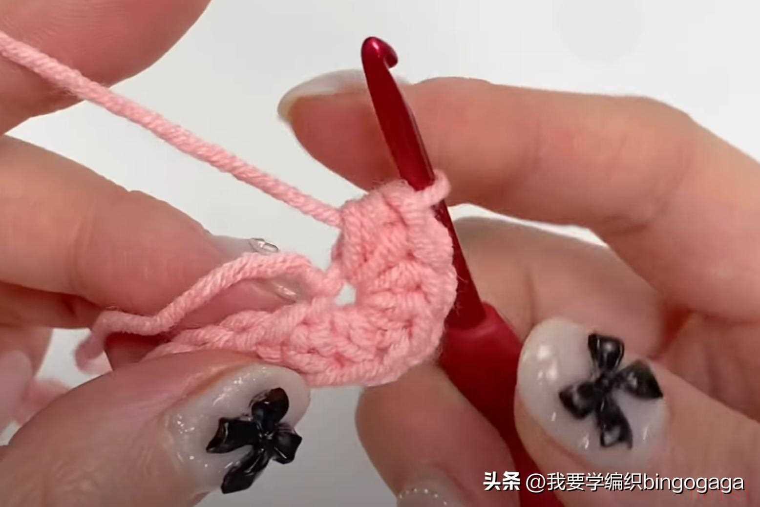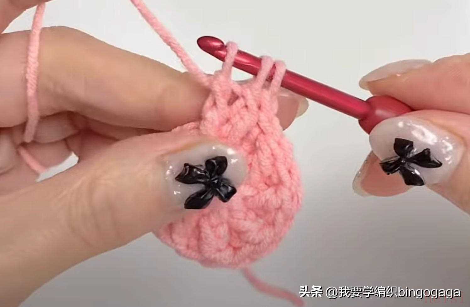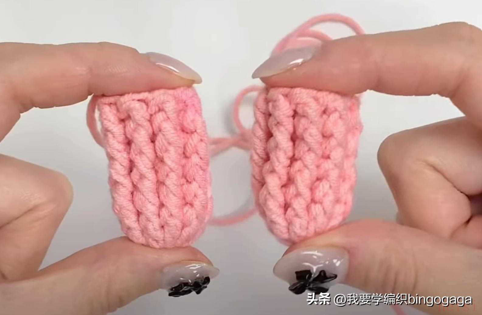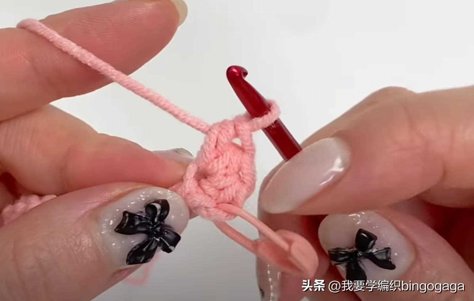 先钩鼻子,A线第1圈:环起,10针中长针;第2圈10针依次钩1放2(中长针),1短,1放2(短针),1短,1放2(中长针),1放2(中长针),1短,1放2(短针),1短,1放2(中长针),16针,断线;接着换B线来钩包包,起18针锁针,第1圈:挑里山,倒入第2针钩3针中长针,再15针中长针,最后1针上钩6针中长针,再15针中长针,最后在第1针上再钩3针中长针,引拔(每圈引拔),42针。