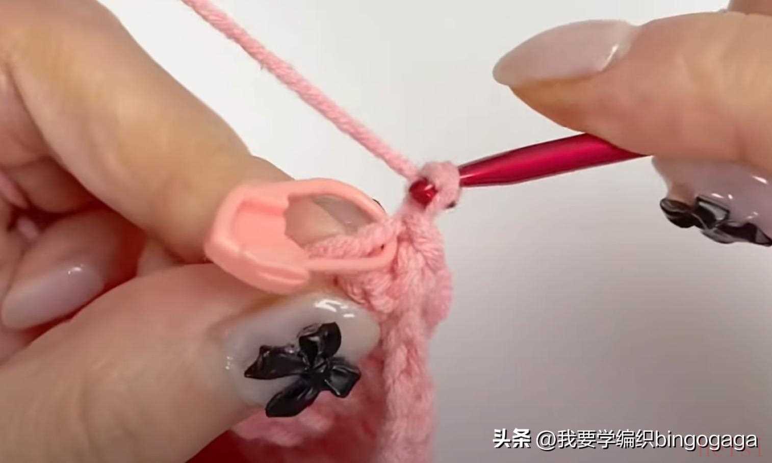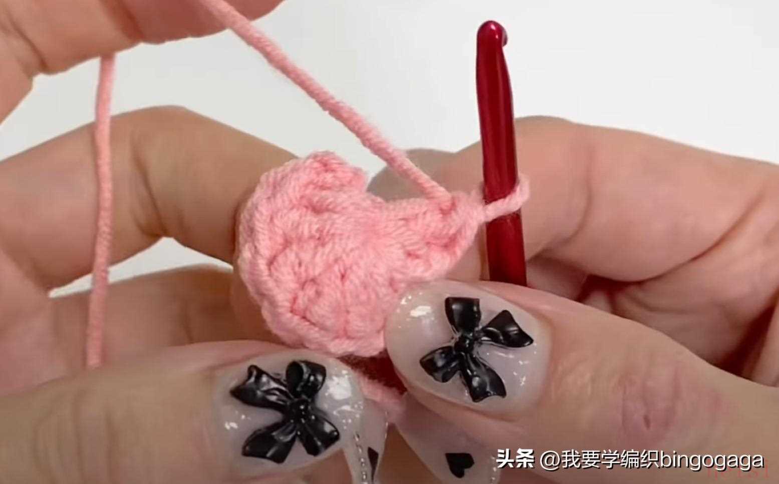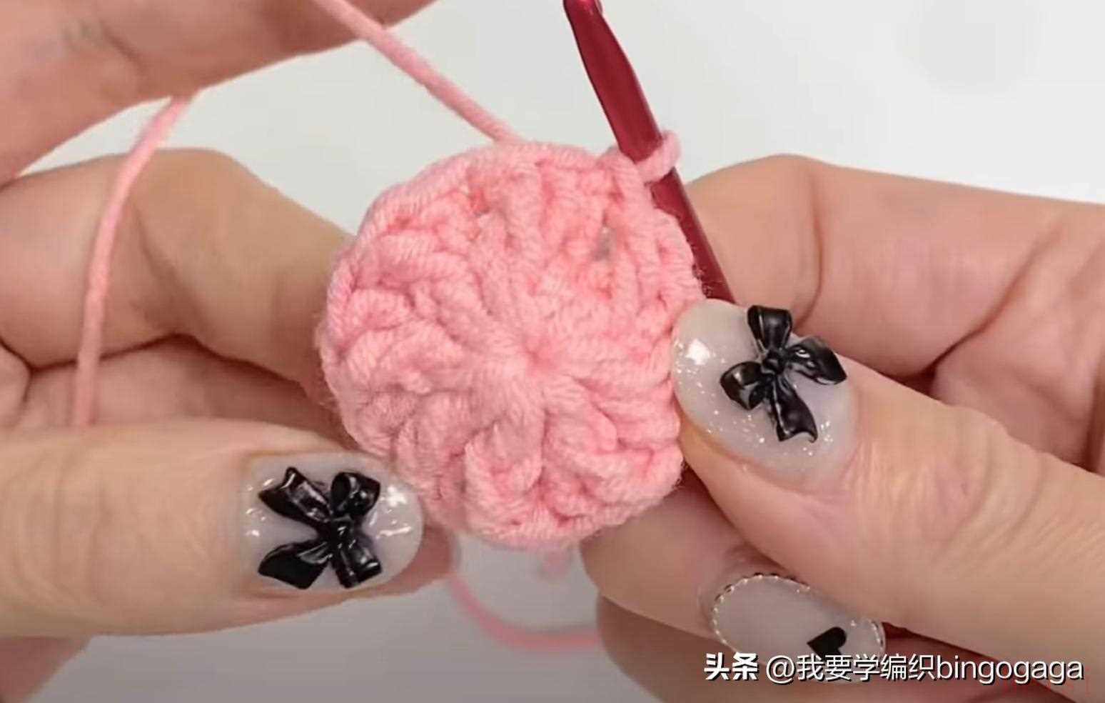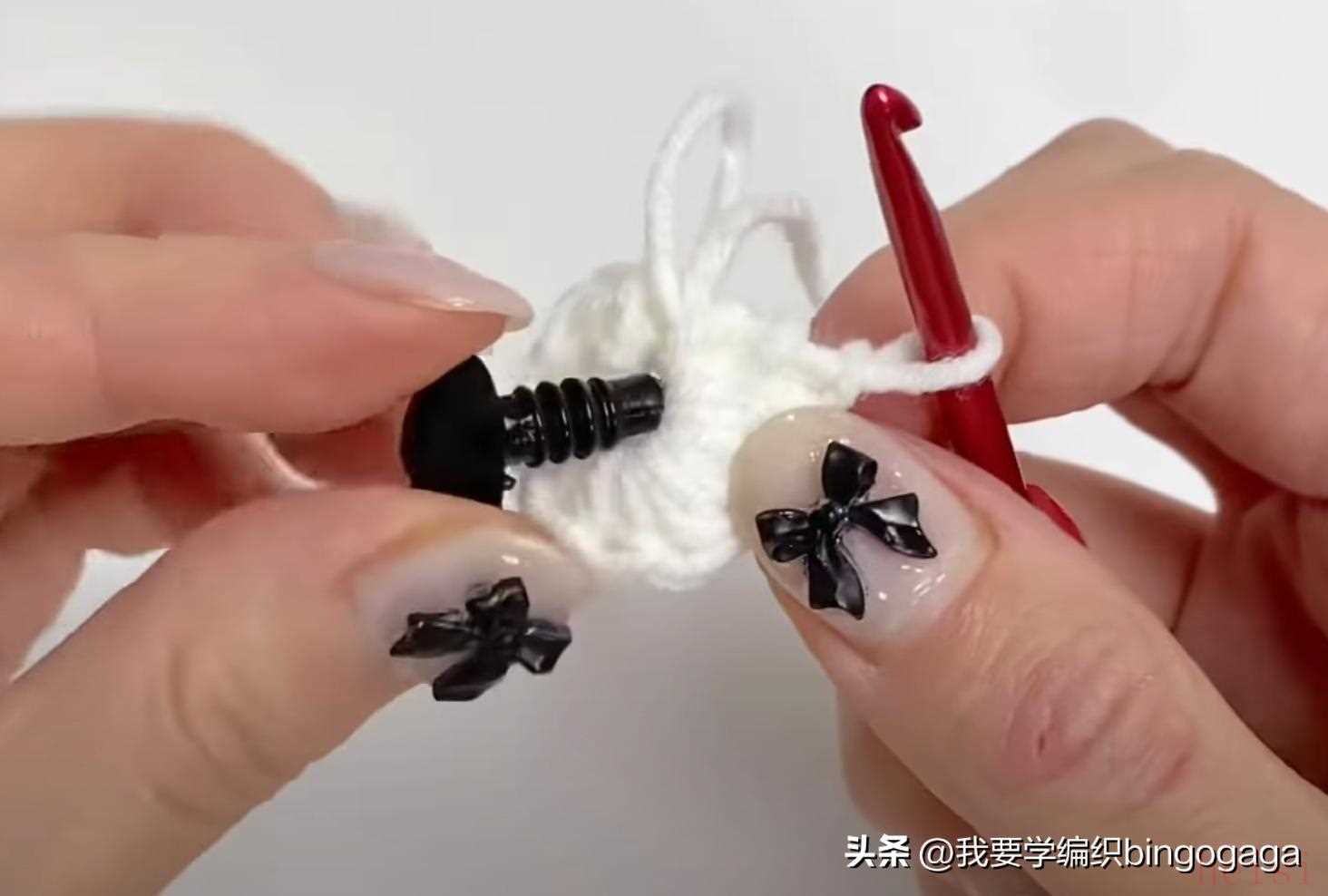 先钩鼻子,A线第1圈:环起,10针中长针;第2圈10针依次钩1放2(中长针),1短,1放2(短针),1短,1放2(中长针),1放2(中长针),1短,1放2(短针),1短,1放2(中长针),16针,断线;接着换B线来钩包包,起18针锁针,第1圈:挑里山,倒入第2针钩3针中长针,再15针中长针,最后1针上钩6针中长针,再15针中长针,最后在第1针上再钩3针中长针,引拔(每圈引拔),42针。
