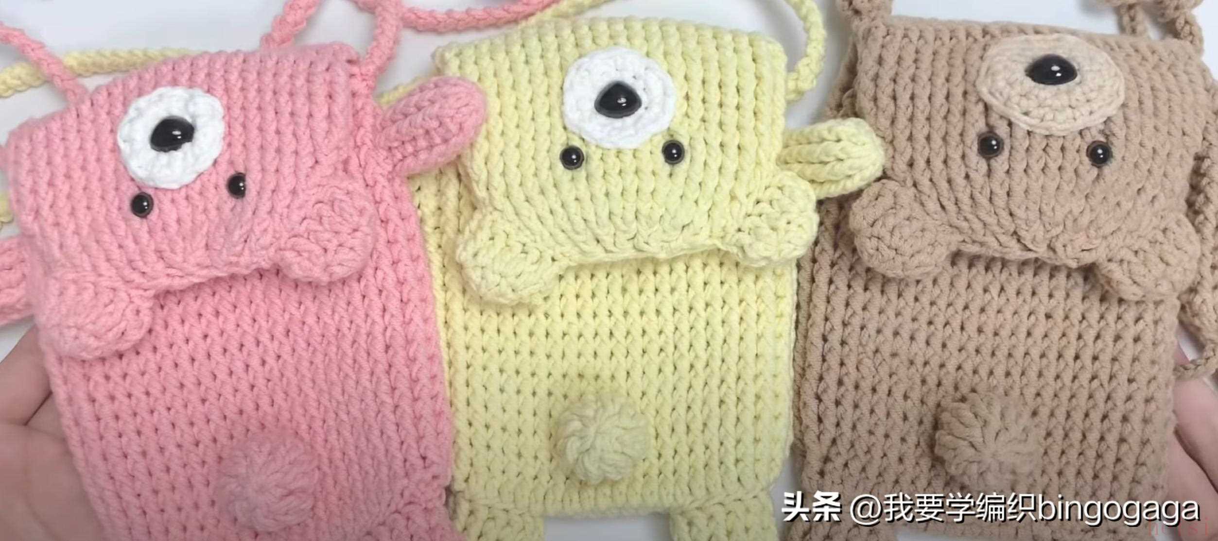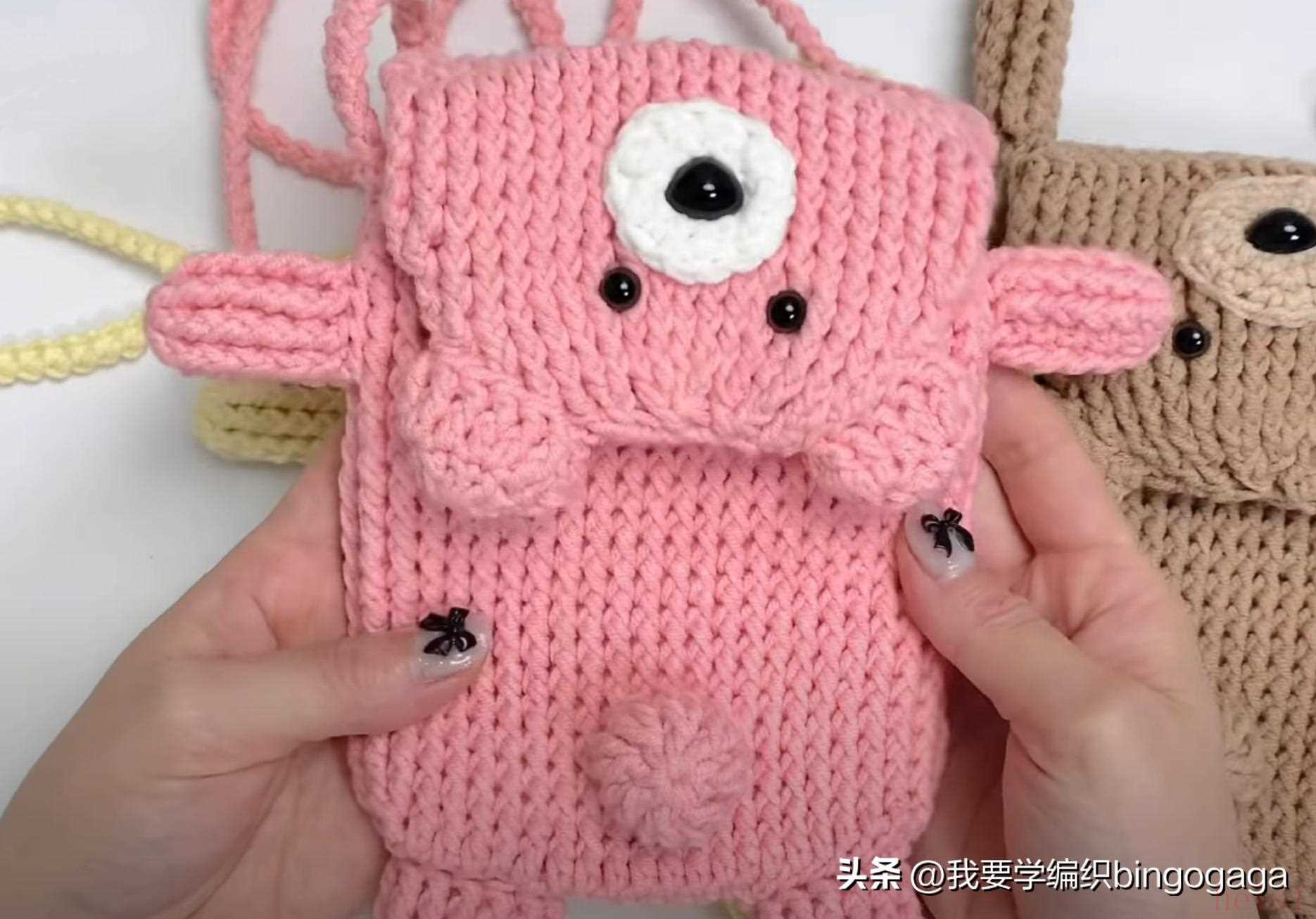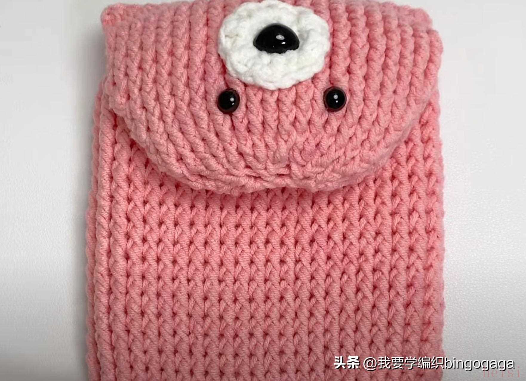 成人孩子都能用的卡通包又来了,今天给大家带来一款小熊手机包的钩法,示范款包包高度约为15厘米,示范用线:棉线,3.5mm的钩针,另外还用到了1.5cm的鼻子及0.8cm的眼睛。