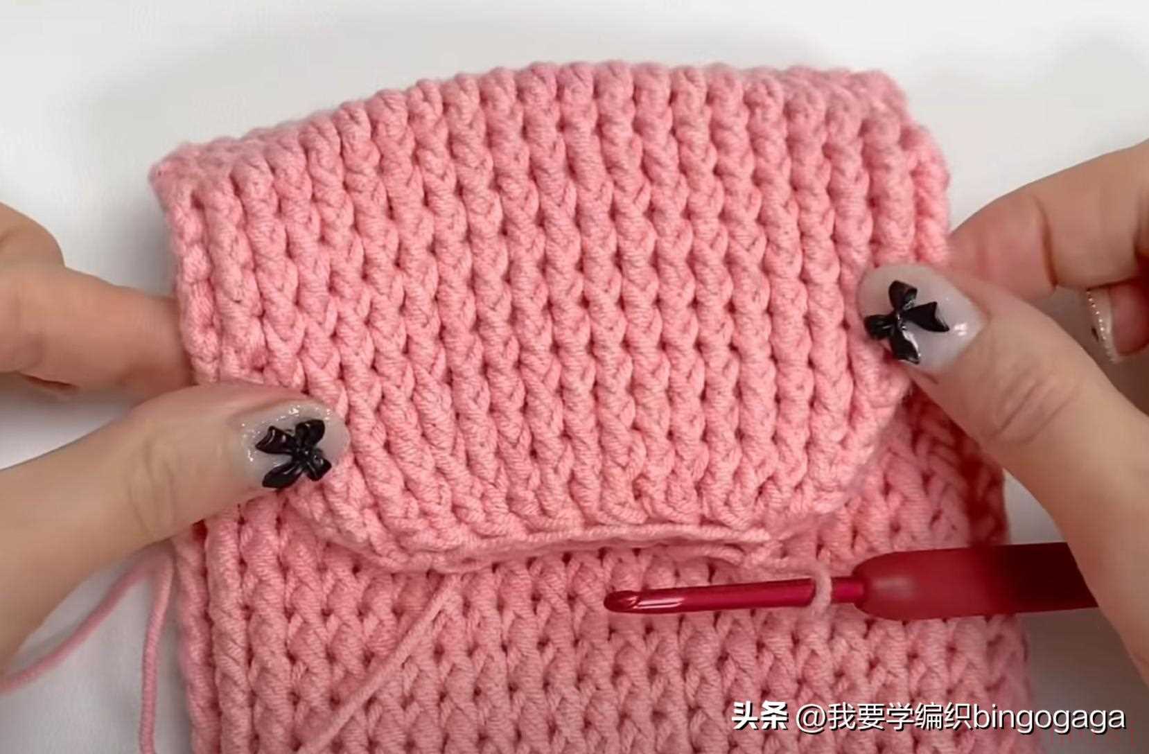 接着来钩腿,第1圈:环起,2锁,10长,与第1针长针引拔(每圈引拔);第2圈:钩外钩长针,(4个1,1放2)*2,12针;第3-5圈:12针外钩长针;再钩1个。将这些零件与包身依次进行缝合,再缝上暗扣。接着来钩包带,从图5处入针,钩1针引拔针,再3锁,倒入第2针钩1短,挑右侧的双线钩短针,后面就重复(挑右侧的双线钩短针)钩到所需的长度,然后与另一边对称处钩引拔针连接,断线。好啦,这款小熊手机包就完工啦~!