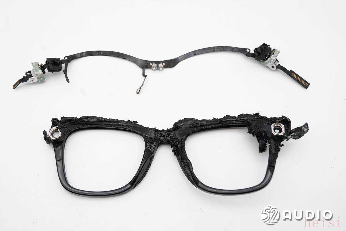 拆开镜框,取出内部排线。镜框采用了超声波塑料焊接,形成了完全密封的腔体,无法正常打开,最终只能使用剪钳一点一点剪碎外壳。