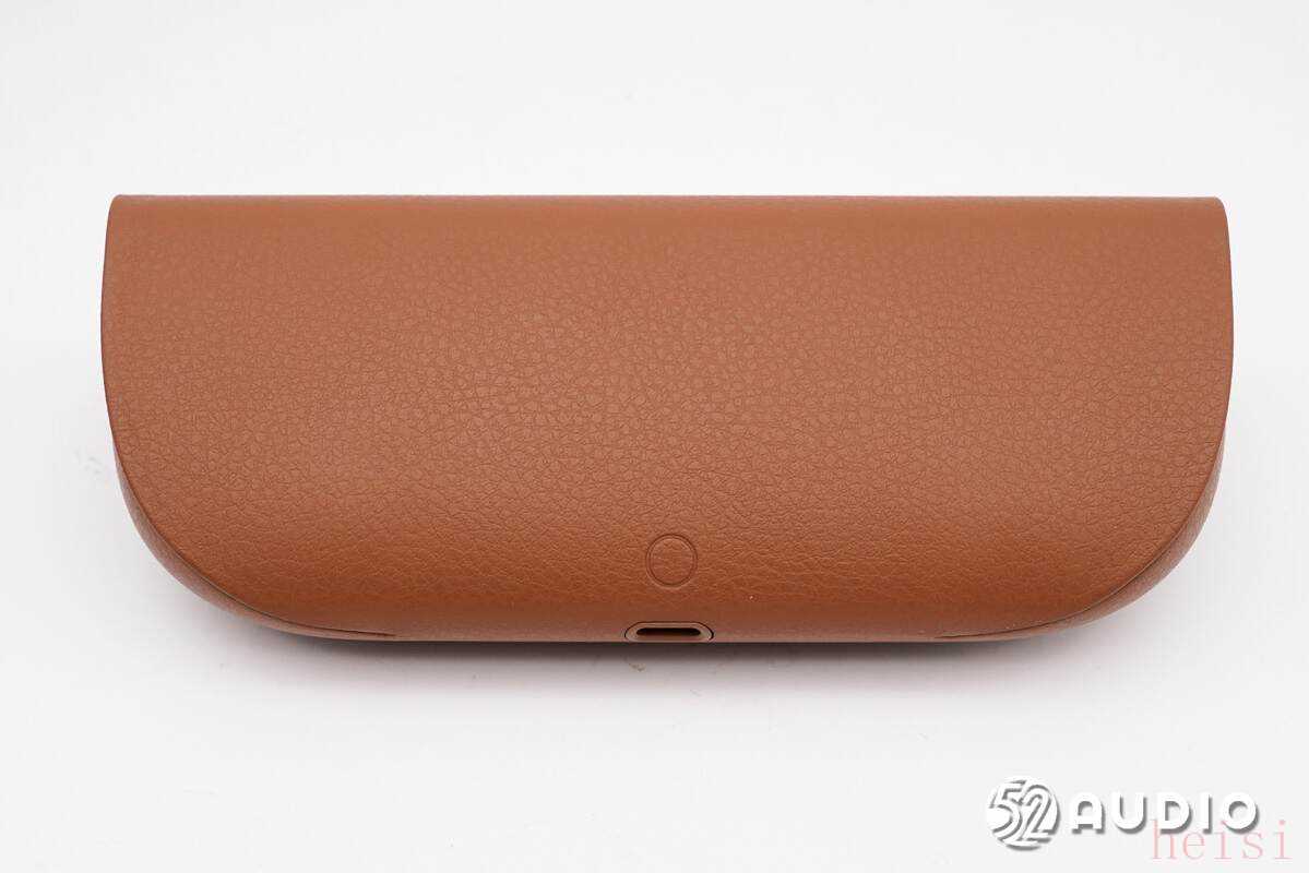眼镜盒正面外观一览,采用了耐磨耐划的皮革材质,外观时尚精致。盒盖采用了磁吸固定,卡扣上同时设计有环形指示灯,用于反馈充电状态。