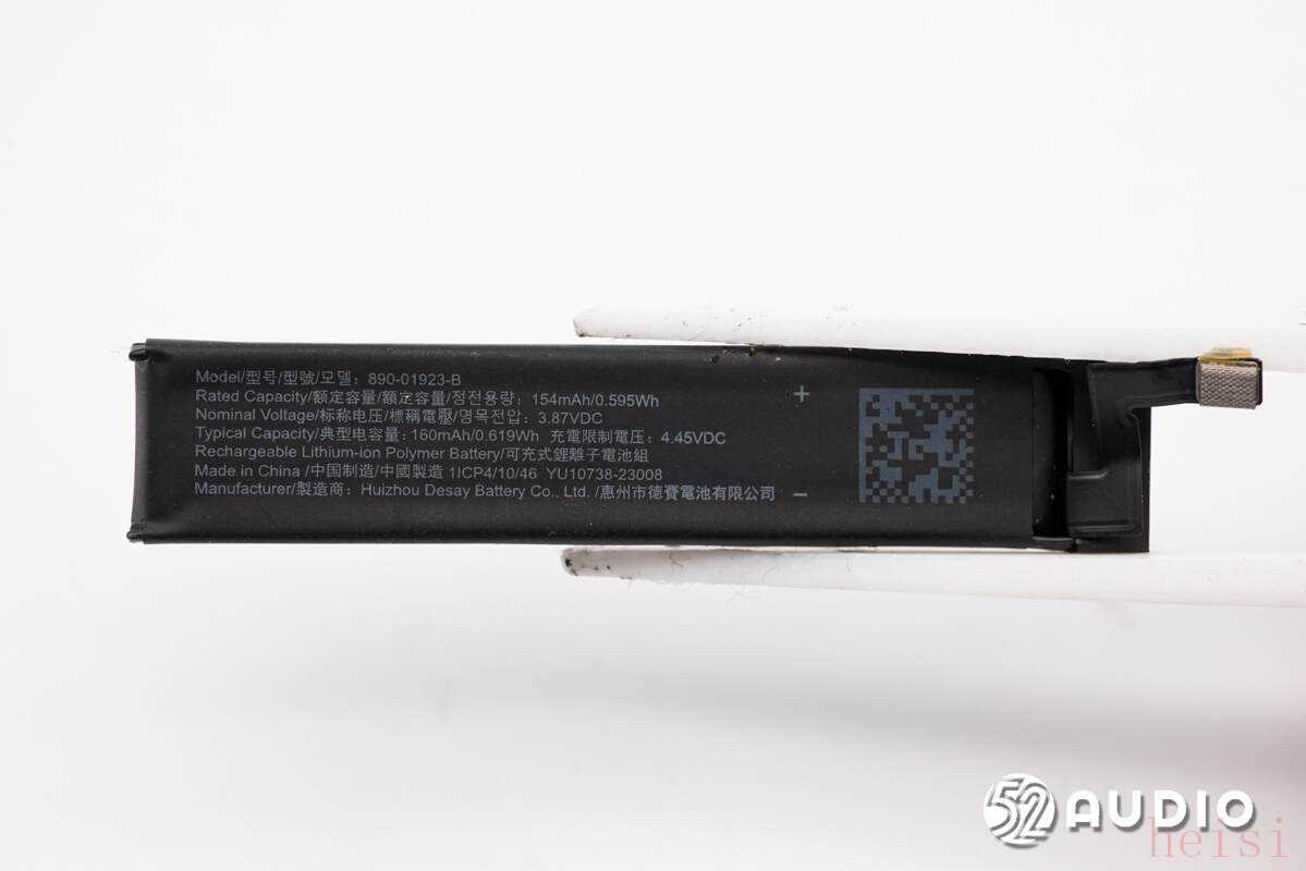 镜腿内置可充式锂离子电池组,型号:890-01923-B,额定容量:154mAh 0.595Wh,标称电压:3.87V,典型容量:160mAh 0.619Wh,充电限制电压:4.45V,制造商:惠州市德赛电池有限公司。