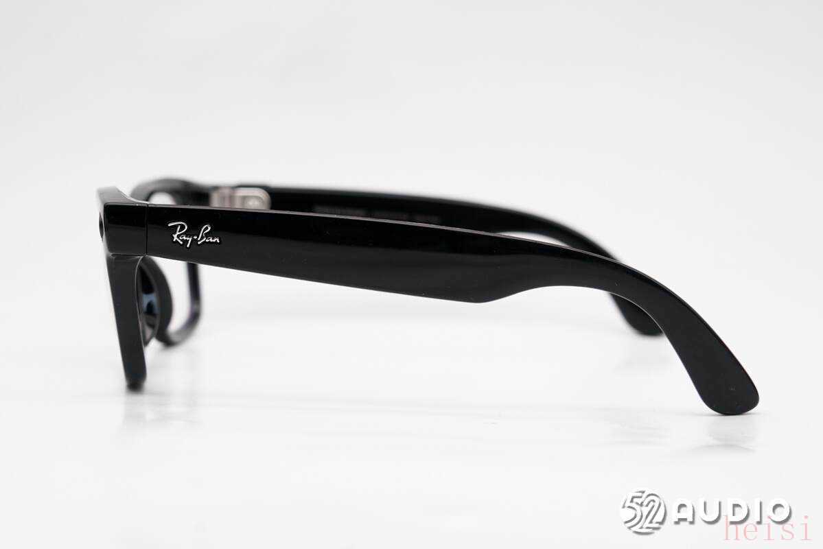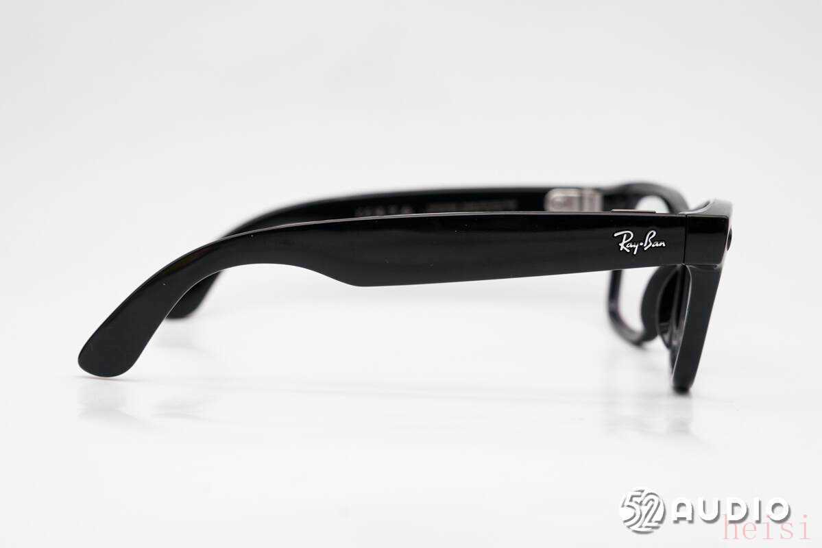 眼镜右侧外观一览,浮雕“RayBan”品牌LOGO。再靠后位置为触控区域,实现多功能便捷控制。