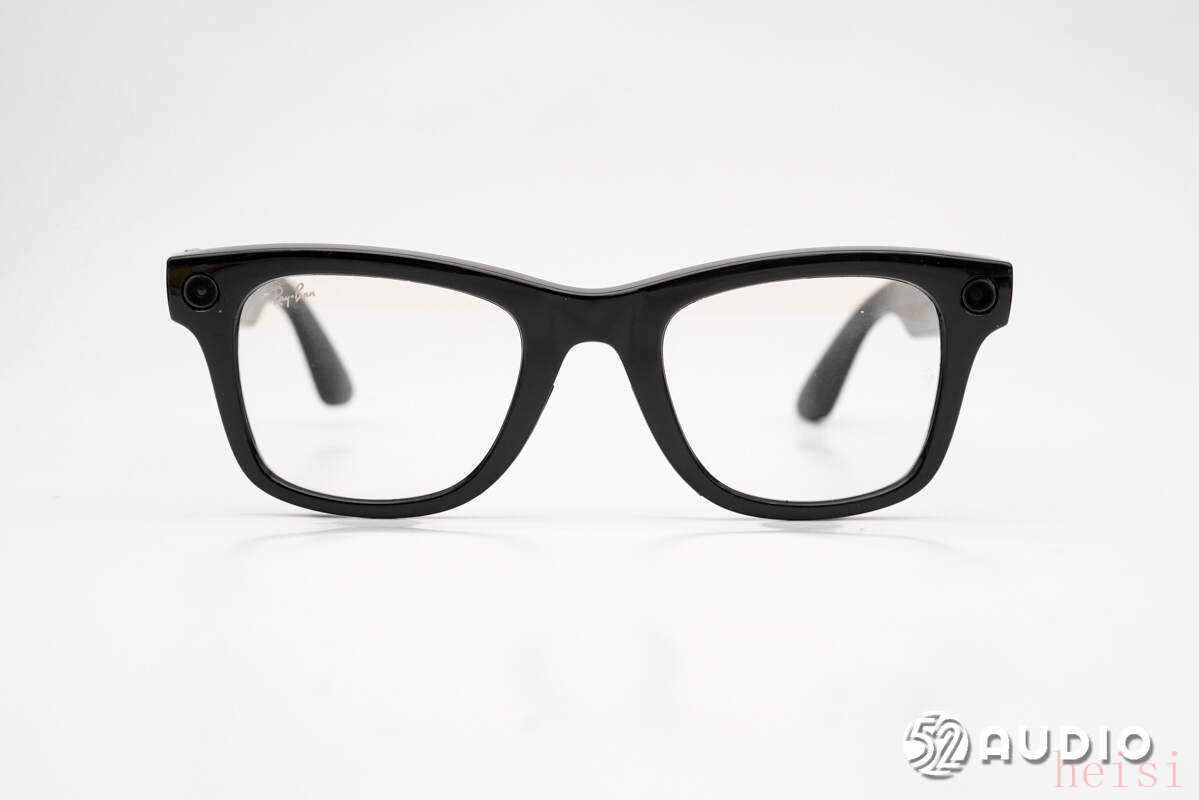 雷朋Meta Wayfarer智能眼镜正面外观一览,预装透明防蓝光镜片,光学镜片需要自主验配。镜框两侧,对称设计有摄像头和录制指示灯。