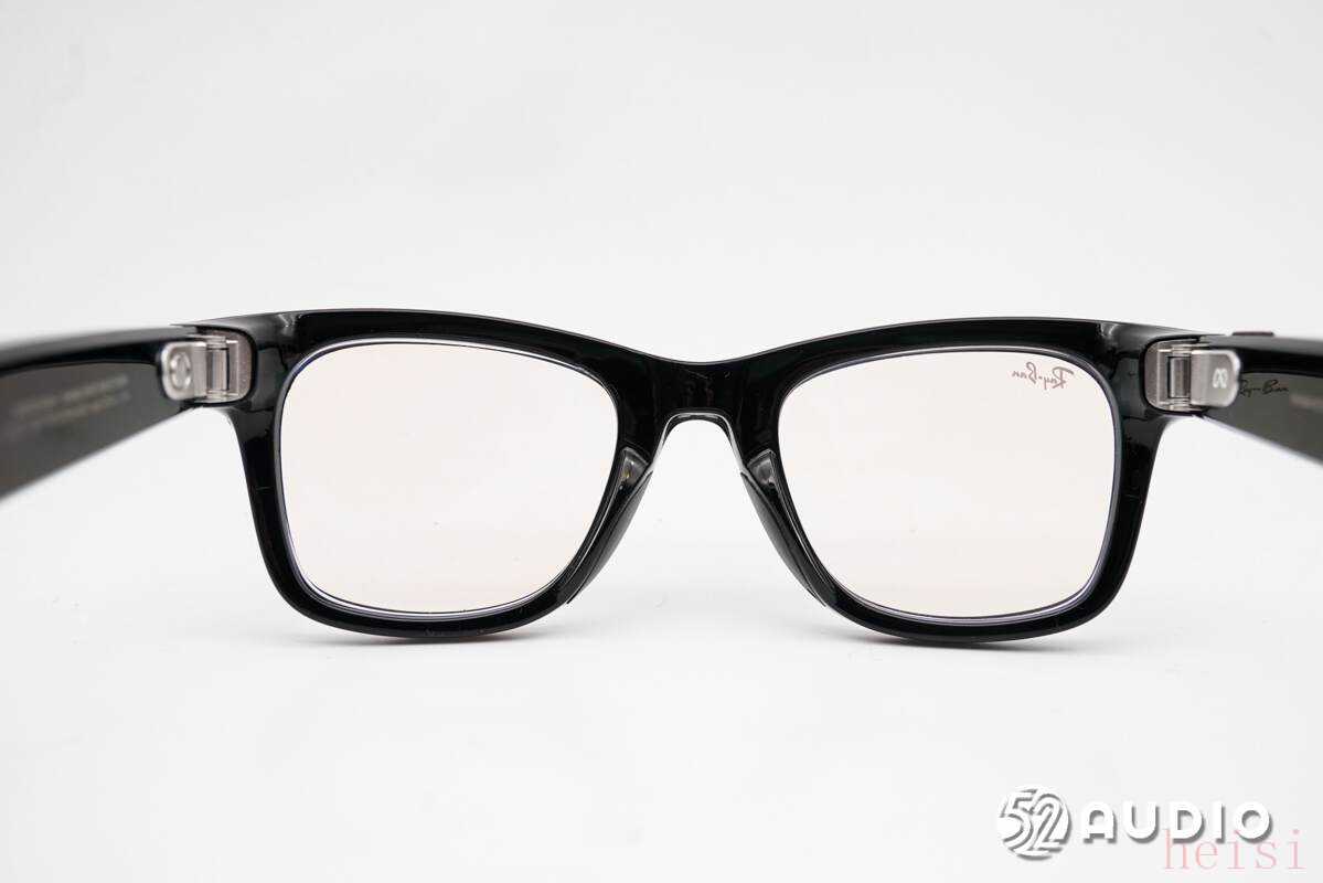 "整体设计:" 沿用了 Ray-Ban Wayfarer 经典的硬朗方形轮廓,金属骨架,醋酸纤维镜腿。整体外观与普通 Ray-Ban Wayfarer 镜框高度相似,保持了品牌的标志性风格。