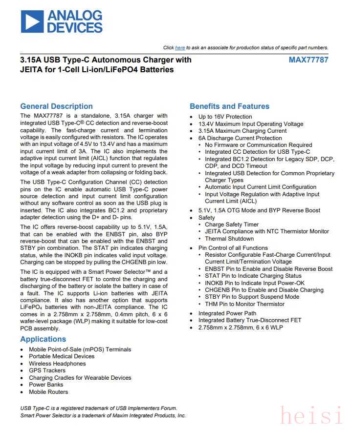 ADI亚德诺MAX77787是一款集成USB Type-C CC检测和反向升压功能的独立3.15A充电器。通过电阻可轻松配置快速充电电流和端接电压。该IC的输入电压范围为4.5V至13.4V,最大输入限流为3A。该IC还实现了自适应输入电流限制(AICL)功能,通过降低输入电流来调节输入电压,以防止薄弱的适配器出现电压崩溃或折返。