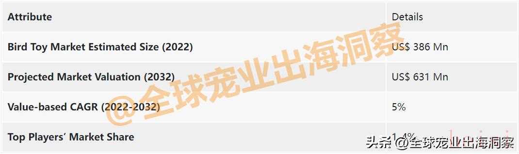市场规模:根据市场研究公司Future Market Insights发布鸟类玩具市场研究报告,据估计,2022年全球鸟类玩具市场的规模达到3.86亿美元。