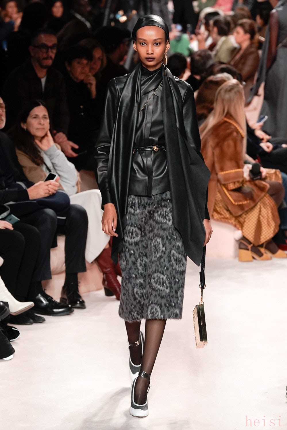 意大利米兰——在Karl Lagerfeld丰富精彩的职业生涯中,他涉足过众多领域,而电影中的服装指导可能是其中提及最少的例子之一。甚至是狂热的影迷Silvia Venturini Fendi也不知情,他曾为法国影星Bulle Ogier在1975年主演的电影《情妇》(Maîtresse)负责服装造型。这或许并不奇怪这一季考虑了这部电影,它讲述了一位女性过着双重生活的故事,在楼上是尽职尽责的资产阶级,地下室里是硬核的施虐狂。电影引发了一场丑闻,最初在英国遭到禁播。Silvia在开始设计新系列之前,喜欢在她的工作室中放映一部电影(95%成员为女性),来营造这一季的氛围。当她播放《情妇》时,有些人走开了,显然几十年后这部电影依然具有震撼人心的能量。它的邪恶影响是为Silvia量身打造的。