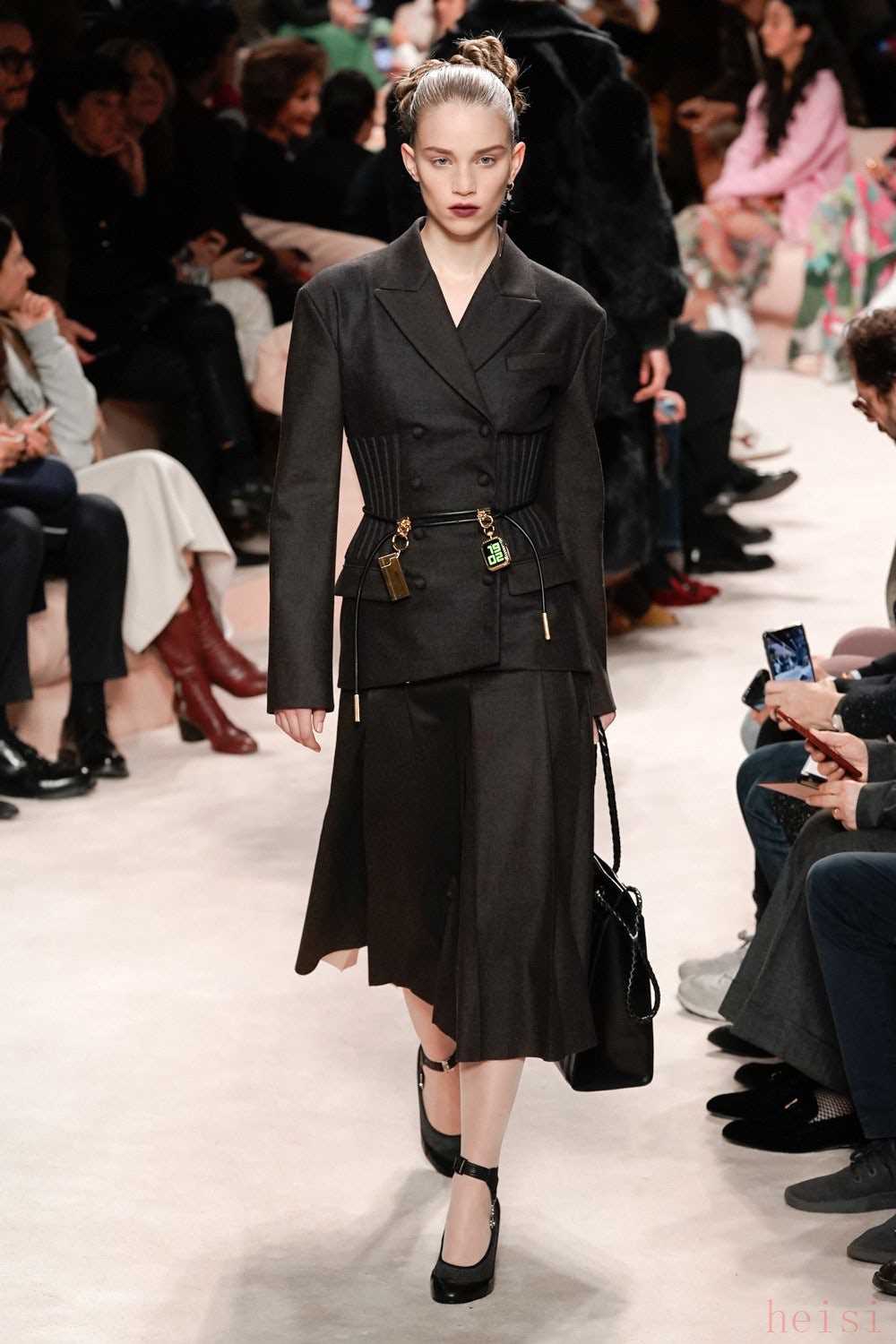 秀场记录描绘了一个不太可能的场景:将闺房带进会议室。谁会被打扰呢?“但是想象一下,董事长有一天身着粉红色的缎面服装,”Silvia若有所思地说。美国联邦调查局(FBI)局长J.Edgar Hoover是出名的异装癖,或许他在自己的卧房中也有过类似的幻想。但是和Fendi更宏观的愿景相比,这不过是小事一桩。“我不喜欢政治,”Silvia说:“但是父权已经失败了,现在是时候改变。我想把‘女权主义者’和‘女性主义’两个词语合并在一起。”请加上“强有力的”。