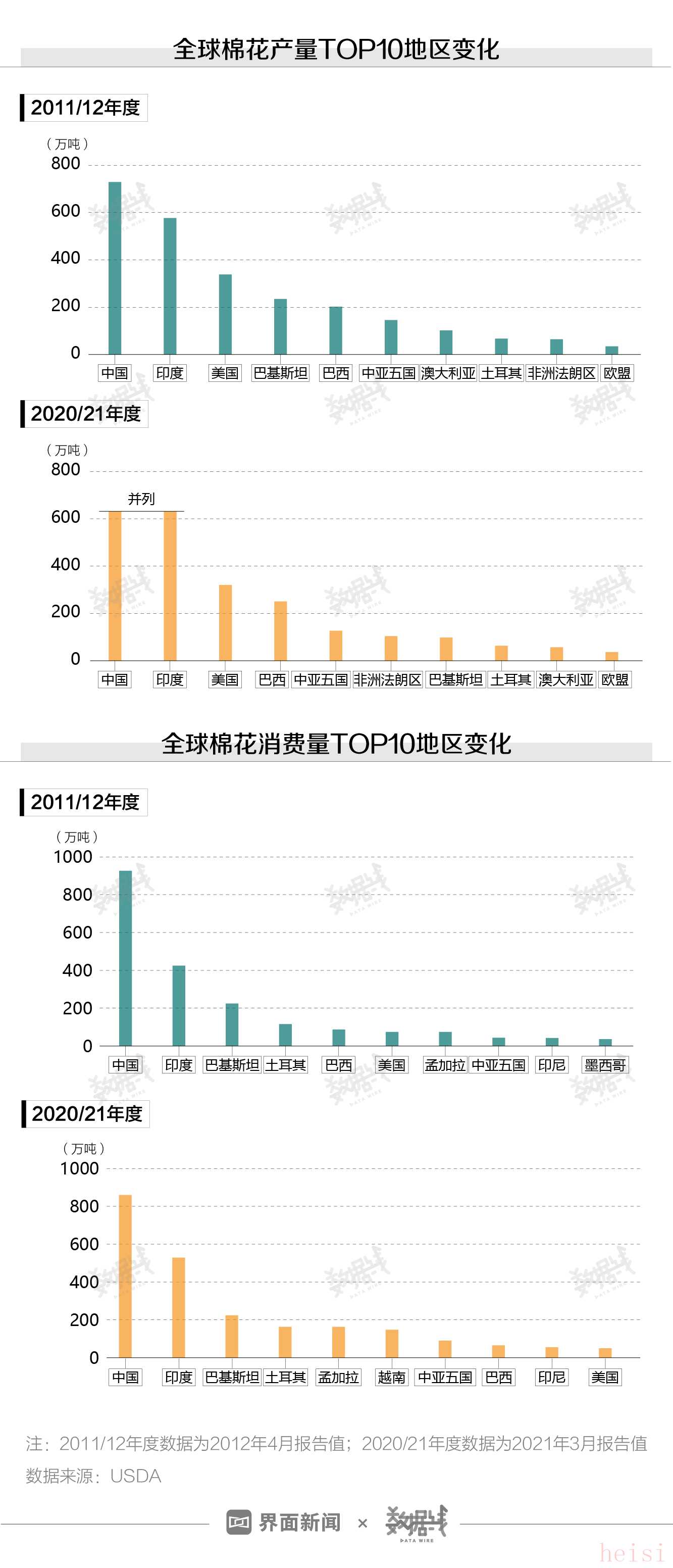 从全球来看,2020/2021年度中国棉花产量及消费量均位居全球第一,与10年前排名相同。但与10年前相比,中国棉花产量及消费量均有所下降。