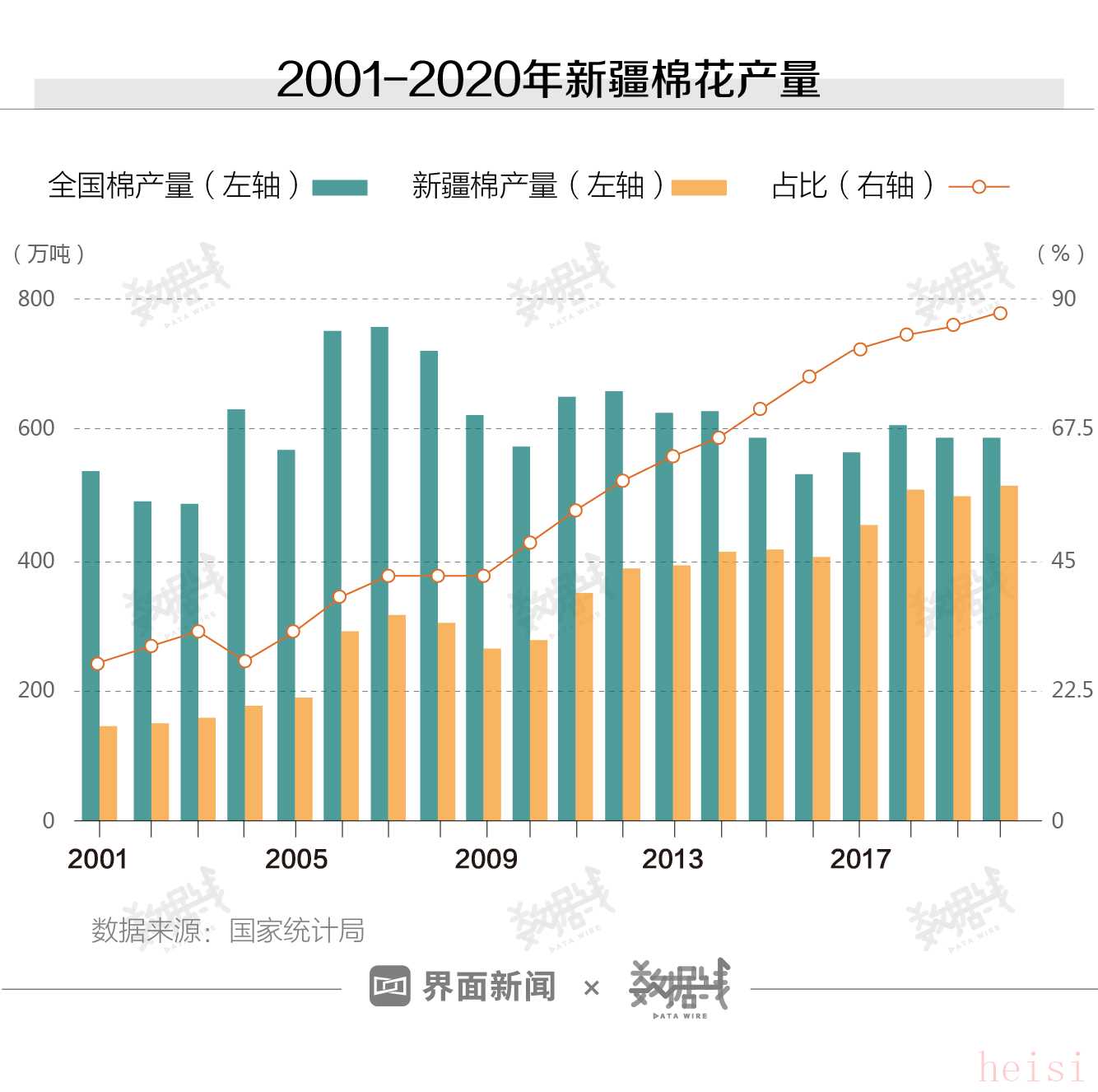 据国家统计局,新疆是中国最大的产棉区。2001年至2020年,新疆棉花产量占全国产量比重从不足30%一路上升至87.3%,20年增加了近60个百分点。