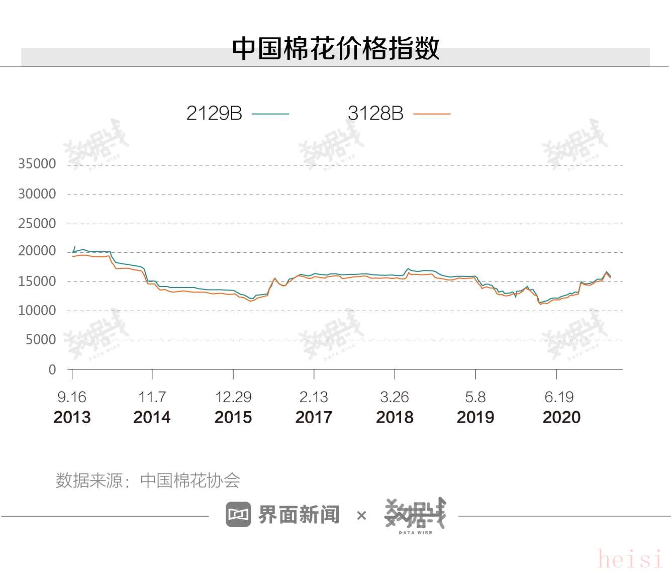 从价格来看,据中国棉花协会,2020年5月以来中国棉花价格指数连续11个月实现同比增长。截至2021年3月,2129B级棉花价格为16442元/吨,同比增长358%,3128B级棉花价格为16103元/吨,同比增长277%。