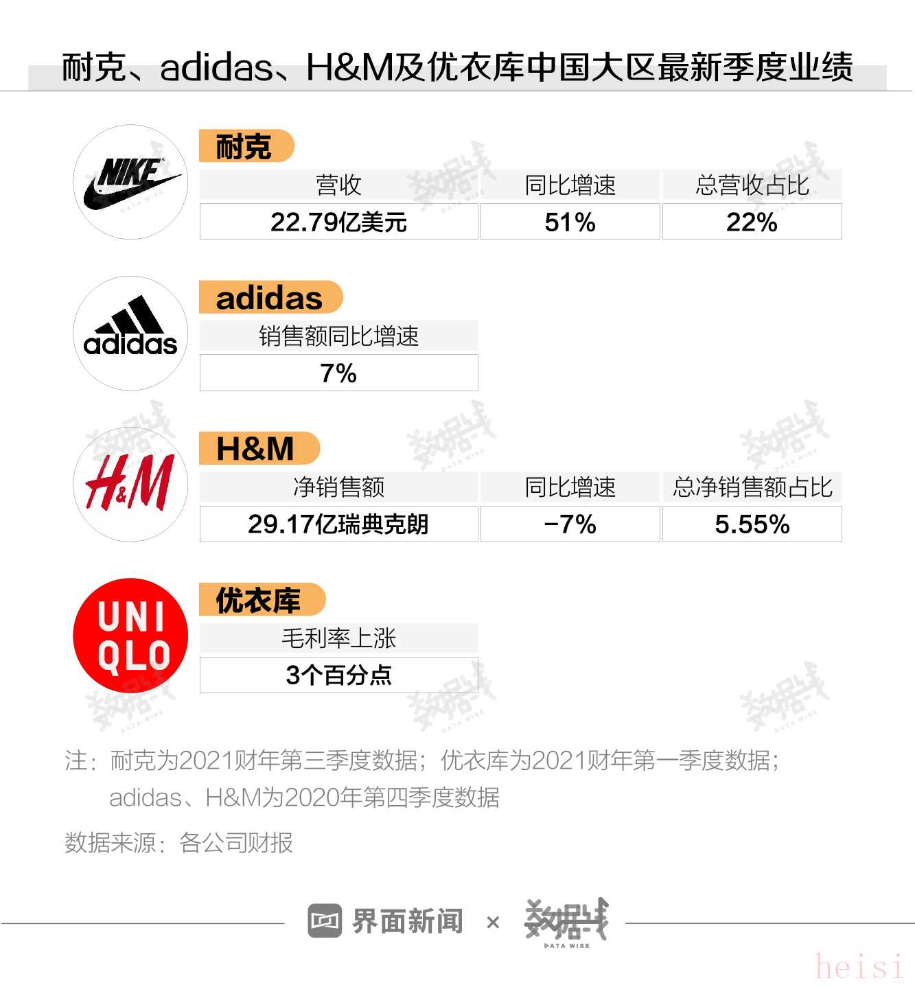 中国对于这些企业重要吗?以耐克、阿迪达斯、H&M及优衣库4家企业为例,其中,耐克2021财年第三季度在大中华区的营收为22.79亿美元,同比增长51%。H&M集团2020年第四季度在中国的净销售额下滑,同比下降7%。