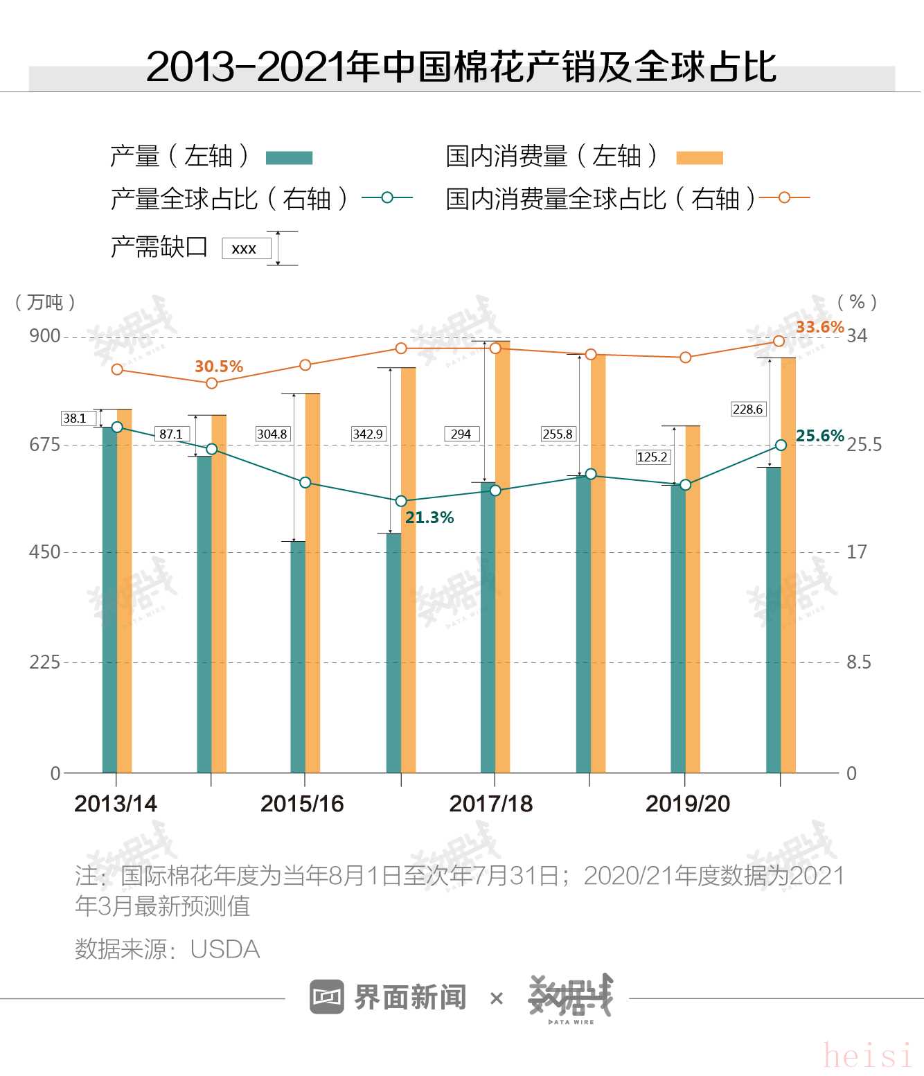 中国生产的棉花自己都不够用。USDA最新预测数据显示,2020/21年度中国棉花产需缺口达228.6万吨,比去年同期多了82.6%。此前,2016/17年度,中国棉花产需缺口高达342.9万吨。