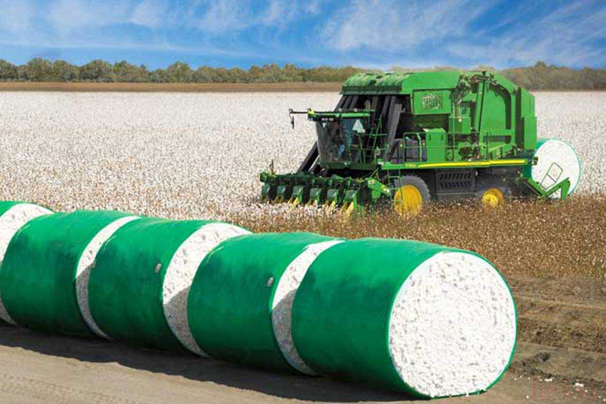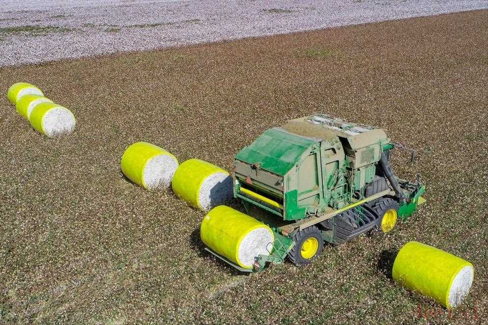 那么这些棉花就会被送至采棉机上的圆形打包机中,打包成最大直径为2.29米、 最大宽度为2.39米圆形棉包