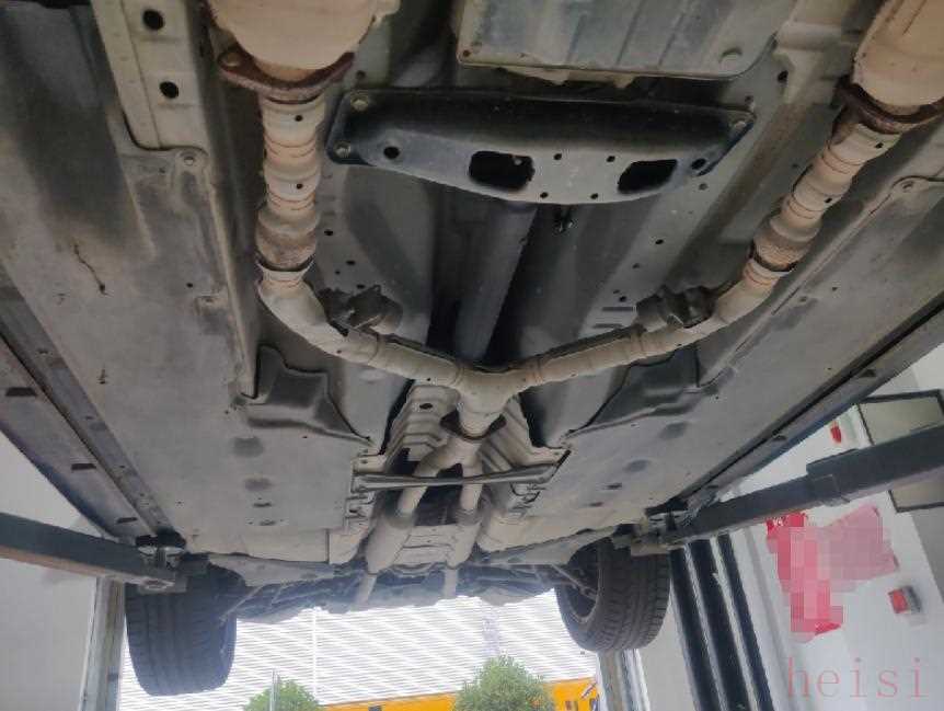 把车子升举起来之后,一眼望过去整个底盘没有明显的损伤剐蹭,底盘的状态比较好。