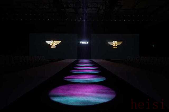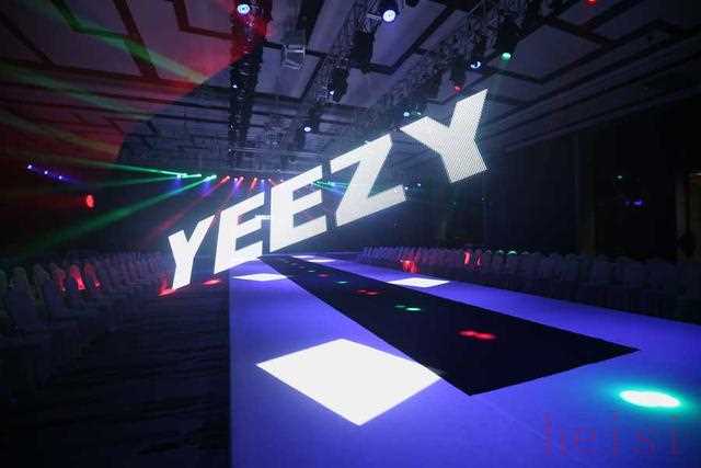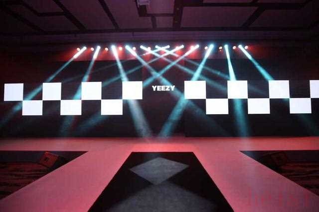 "氛围:" 可能是在一个充满设计感的空间,灯光聚焦,音乐动感,现场布置简约而不失高级感,处处体现着YEEZY的风格。