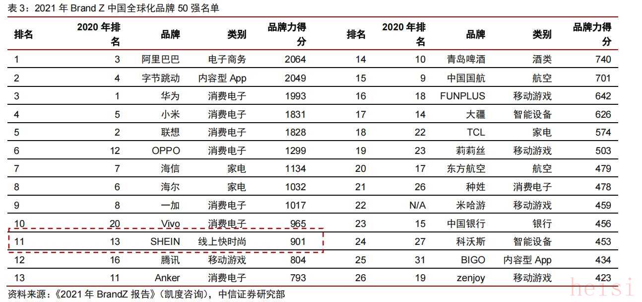 与此同时,《2021年BrandZ报告》显示,Shein在中国全球品牌年度指数中排在第11位,前面是阿里巴巴、字节跳动、华为、小米、联想等,后面则是腾讯、青岛啤酒、中国国航、大疆、TCL、米哈游等。