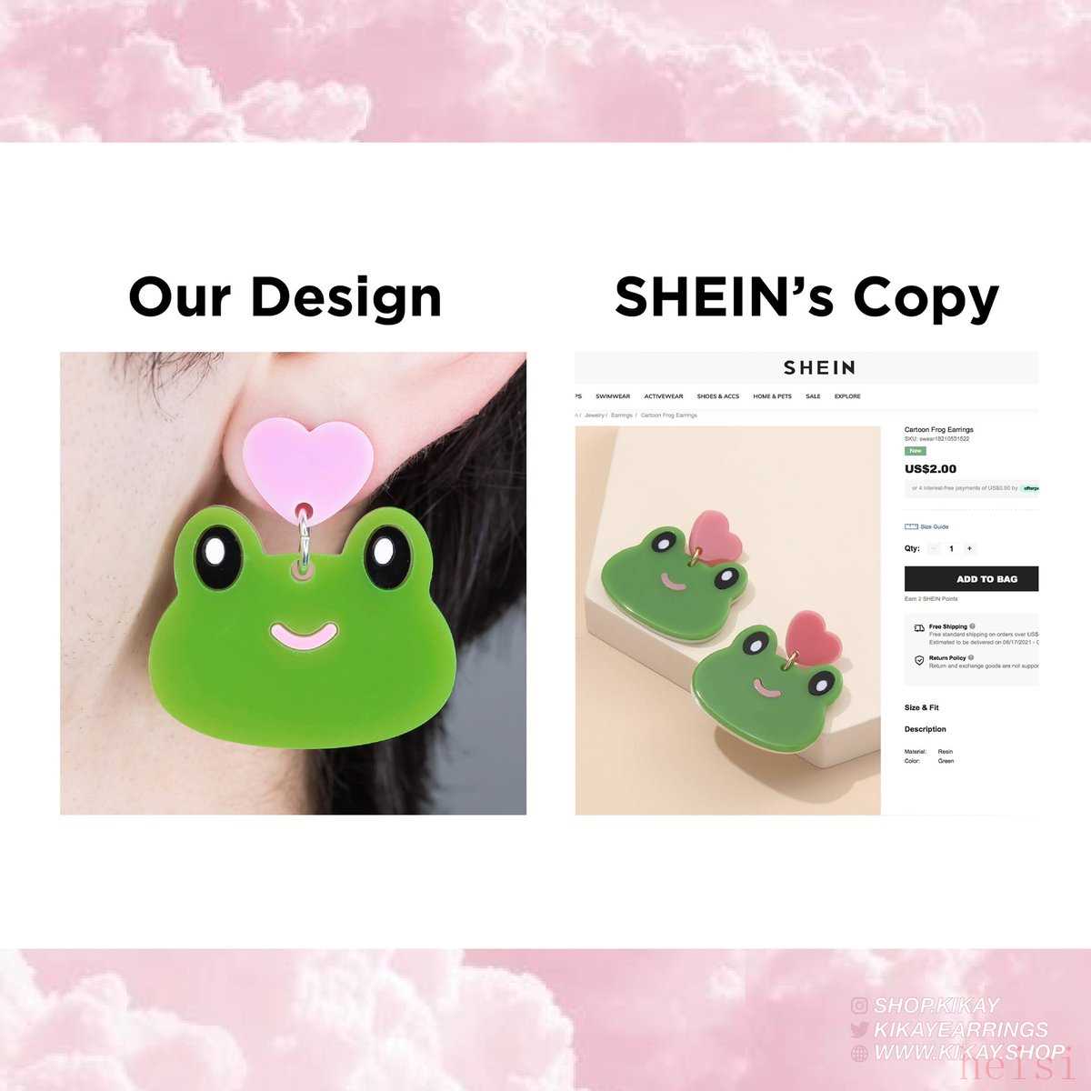 同月,美国洛杉矶耳饰电商品牌Kikay在Instagram上指控,Shein所售的一对青蛙耳环产品与其在2020年11月推出的原创设计耳饰十分相近,质疑前者抄袭。