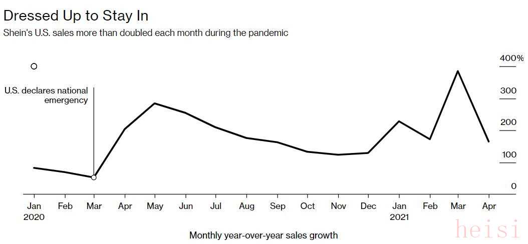 在新冠大流行期间,Shein在美国的销售额每个月都增加一倍多