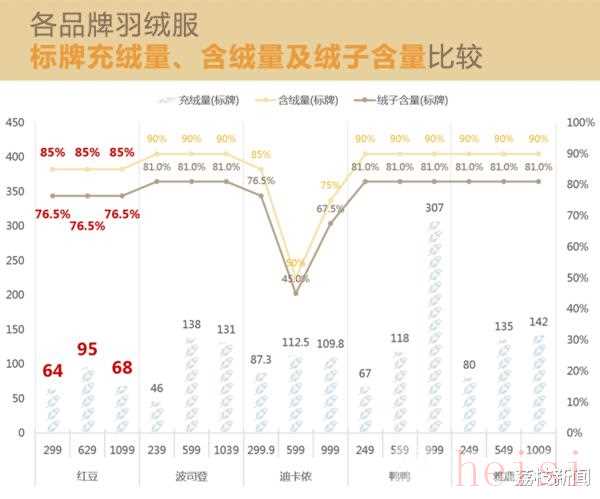 根据检测得出,除了迪卡侬主打运动功能的滑雪服标志值较低外,红豆标示的含绒量和绒子含量均比其他品牌低5个百分点左右。这意味着什么呢?简单来说就是羽绒服的保暖性能相对较低。