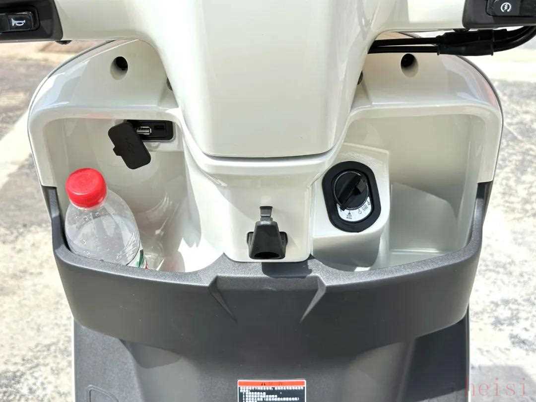 菲梦125采用了两个前置开放式的手套箱,两边都能够放进去500ml矿泉水,另外中间还有一个挂钩,同时在左侧手套箱上面,还有USB+Type-C的充电接口。除此之外,这台车竟然还配备了无钥匙启动功能。