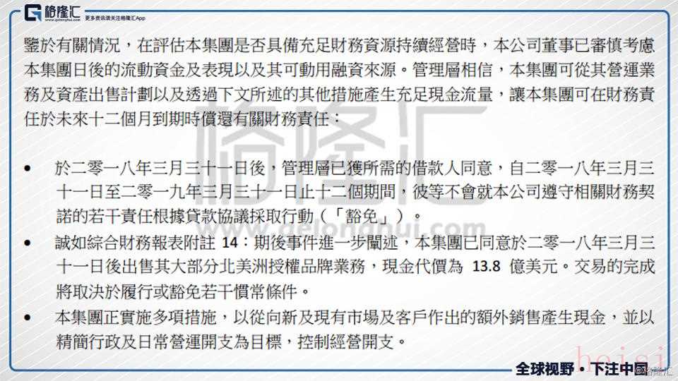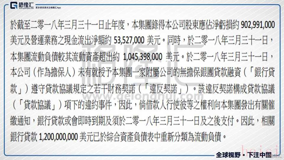 利标这次出售除了派特别息,还有就是偿还借款。2017年财年账上长期借款是11.18亿美元,而18财年长期没有了,短期借款变成了12.01亿美元。翻公司的业绩公告,这个里面12亿美元是2015年公司与银行签订的承诺银团信贷融资,到2018财年,公司已经提取完。根据公司的注释,由于违反若干契诺要求,这个12亿美元的银行贷款已分类至流动负债。