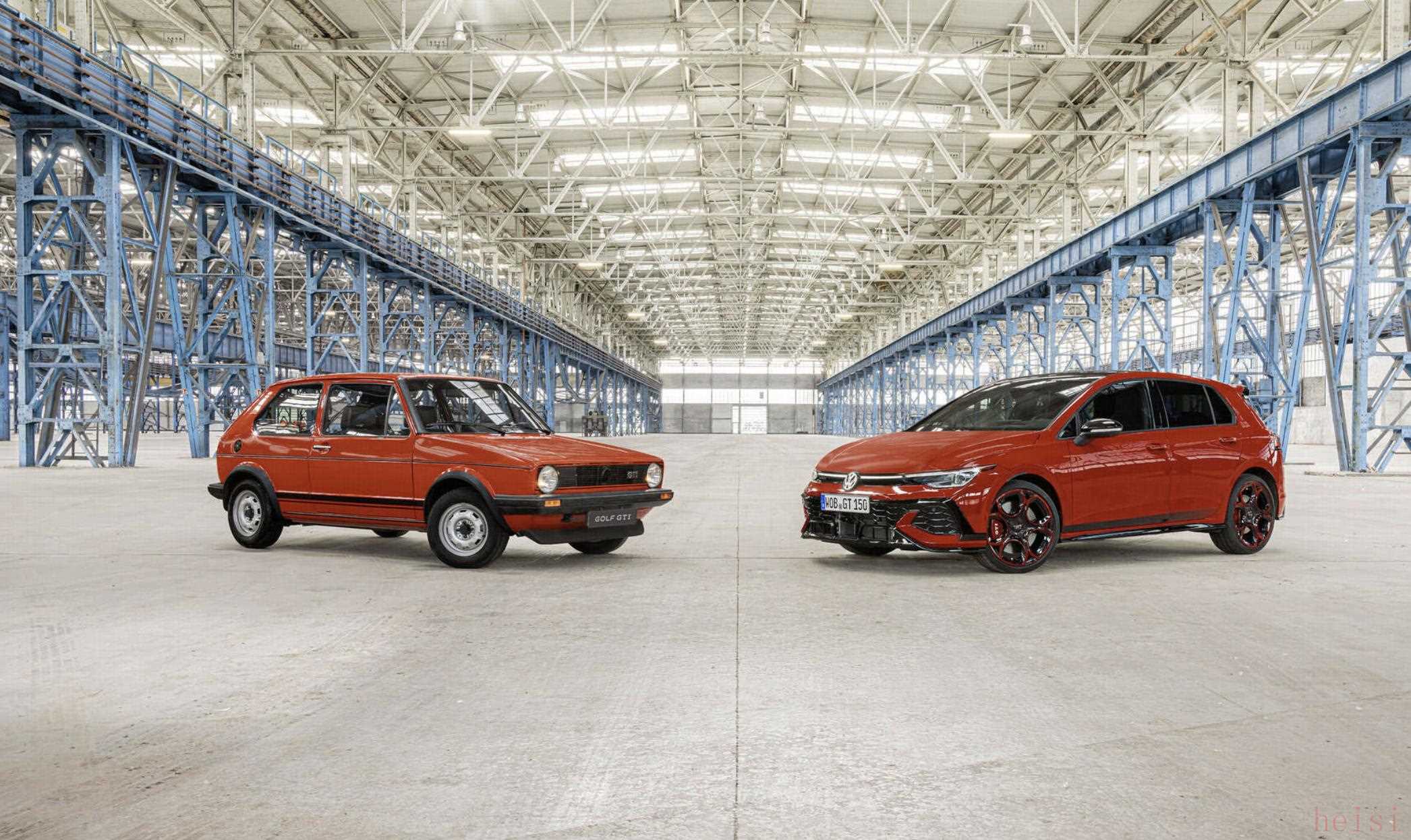 初代高尔夫GTI(左)和高尔夫GTI 50周年纪念版(右)