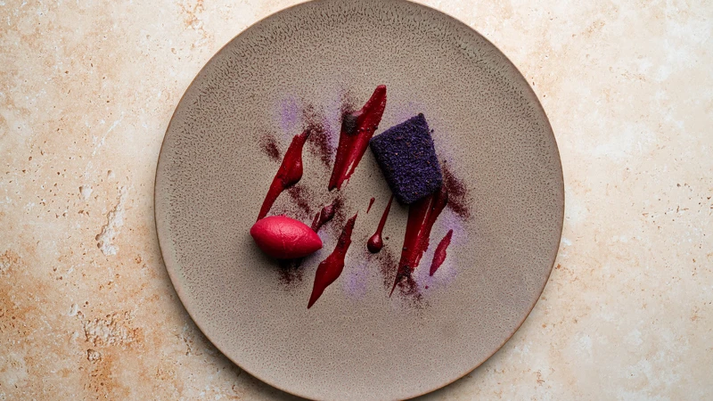 这次的餐会由白水主厨率领副主厨与两位助手亲自来台,以九州海洋记忆为主轴,与高雄风土展开料理对话。开场以台湾养殖鲟龙鱼与鱼子酱入题,从鱼肉到鱼卵呈现完整的生态链,紧接着以番茄的不同形态组构出明快层次。冷前菜以泥、渍、薄片三种技法演绎单一食材的多样面貌,配上苹果与甜菜根结合的紫色布丁肠作结,让整体节奏柔和而克制。