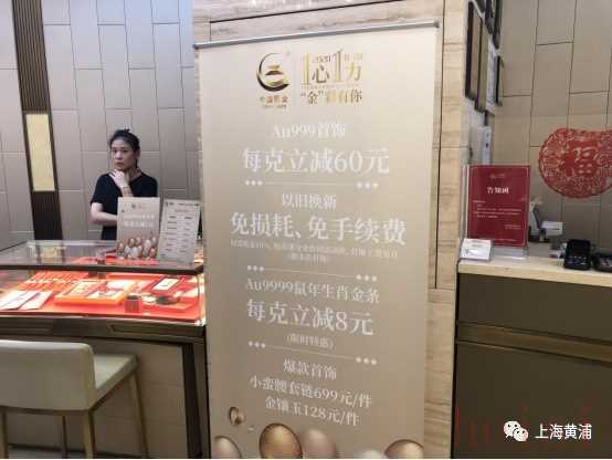 店员告诉记者,8月28日-8月30日,中国黄金上海旗舰店推出多款超值尊享活动:足金首饰最多每克立减60元,免费以旧换新;四九鼠年生肖金条立减8元/克;店庆限时爆款特惠,时尚K金小蛮腰套链低至699元;硬金手串1088元起;更有128元金镶玉满满福气带回家;钻饰低至5.8折等钜惠活动。