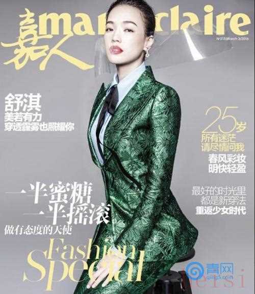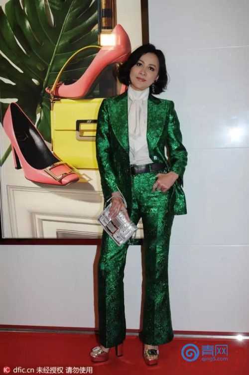 舒淇拍摄杂志封面也是这个look,这套绿的发光的西装也是够火,不过也只有女神级别才能完美驾驭吧……
