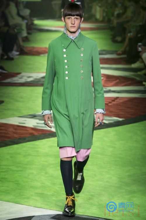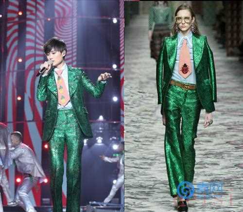 春春的时尚资源也是越来越好,在穿着打扮上也是不断突破,这套Gucci 2016春夏系列的绿油油的西装套装就被春春演绎的很有质感。