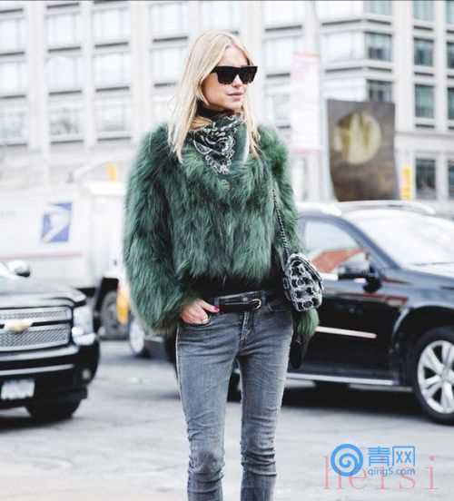 最近皮草貌似有些火?时尚博主Pernille Teisbaek选择绿色的皮草不仅可以演绎低调的华丽风,还可以和那些土气的黑色、棕色皮草拉开档次,展现潮人风范。