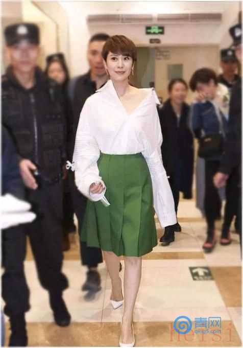 海清选择了西装面料的绿色百褶裙,搭配V领白衬衫尽显职场女性的成熟魅力。