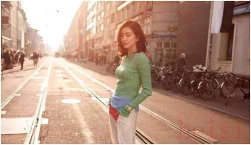 江疏影的绿色针织衫搭配白色裤子,干净,清新,逆着阳光而更加夺目。
